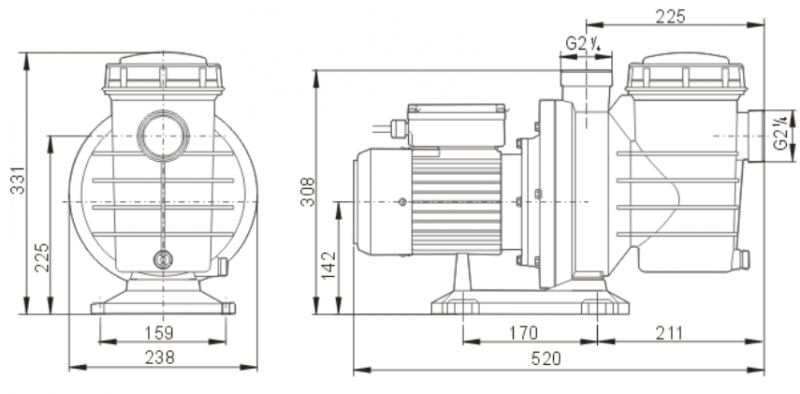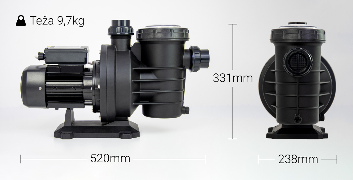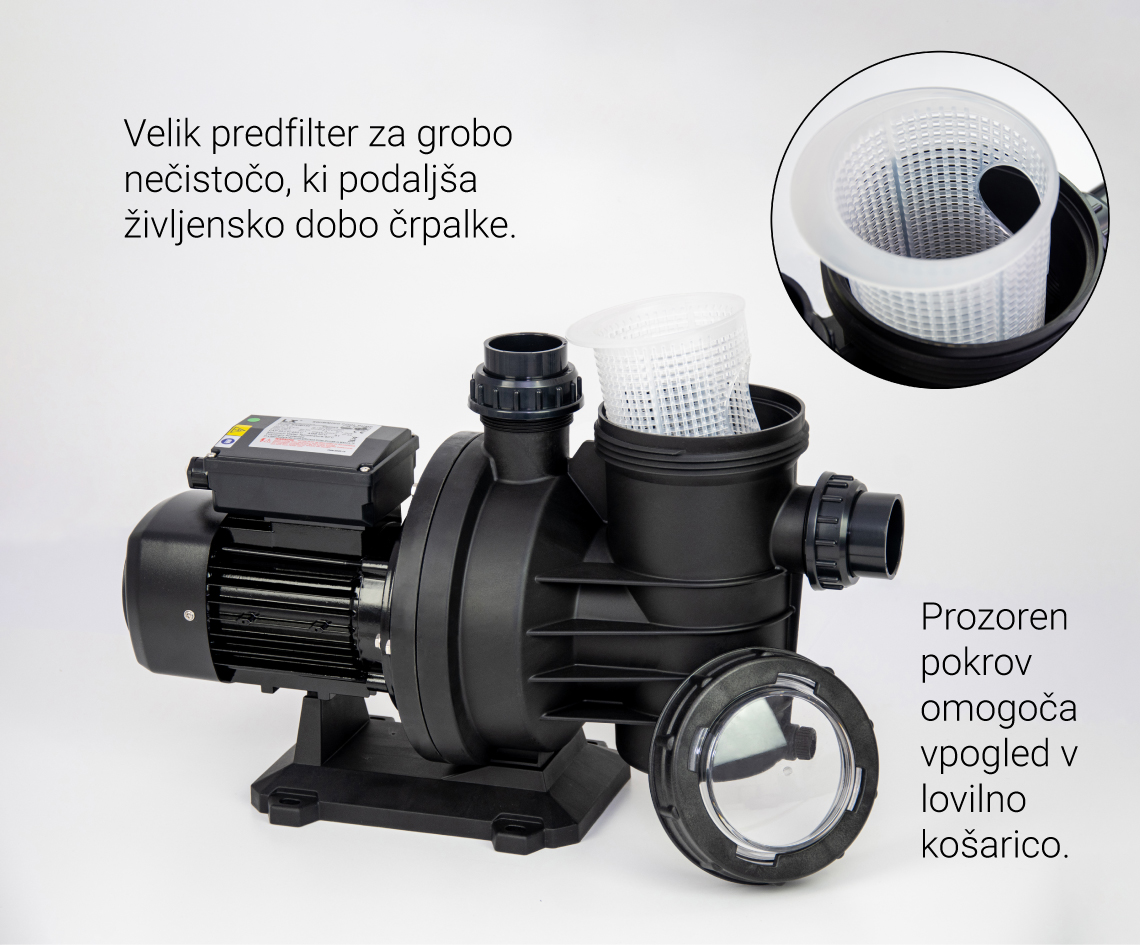 Za bazene do 70 m3 + 750kW + 1.0 KM + pred filter + max. pretok 340 l/m (20 m3/h)
