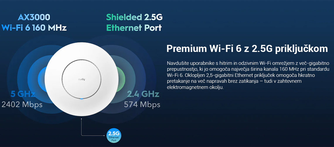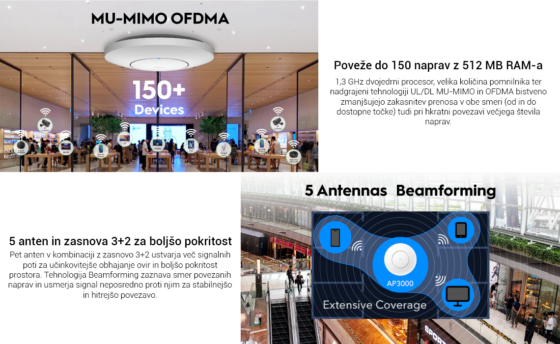 Dostopna točka AP3000_P razglaša 2 ločeni brezžični omrežji, v pasovni širini 5 GHz s hitrostjo 2402 Mb/s in v pasovni širini 2.4 GHz s hitrostjo 574 Mb/s. Tehnologija MU-MIMO omogoča optimizirati prenos podatkov na način vzporedne uporabe več oddajnikov za povezavo z nekaj strankami hkrati, ob upoštevanju izrabe tehnologije oblikovanja snopa radijskih valov (Beamforming - TxBF).