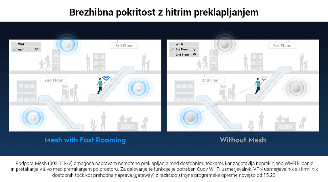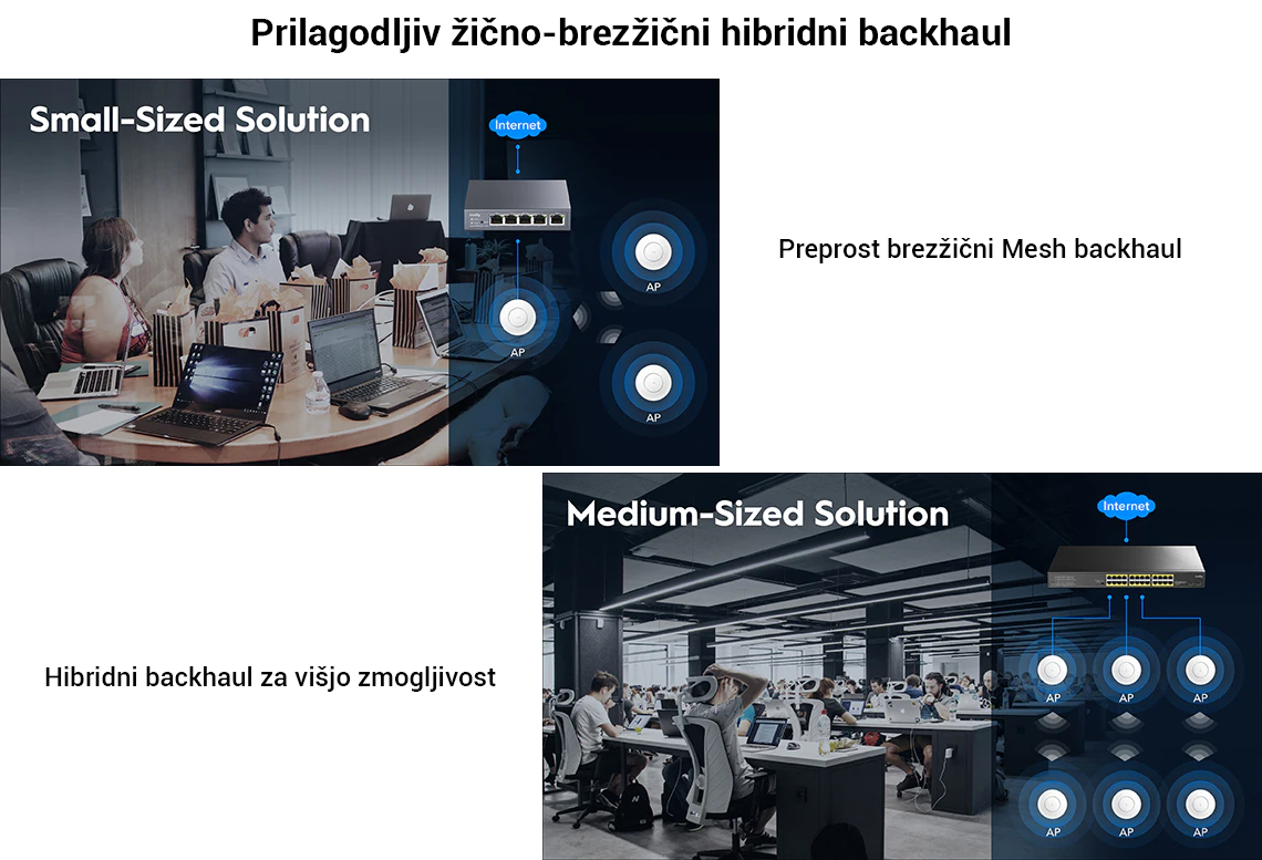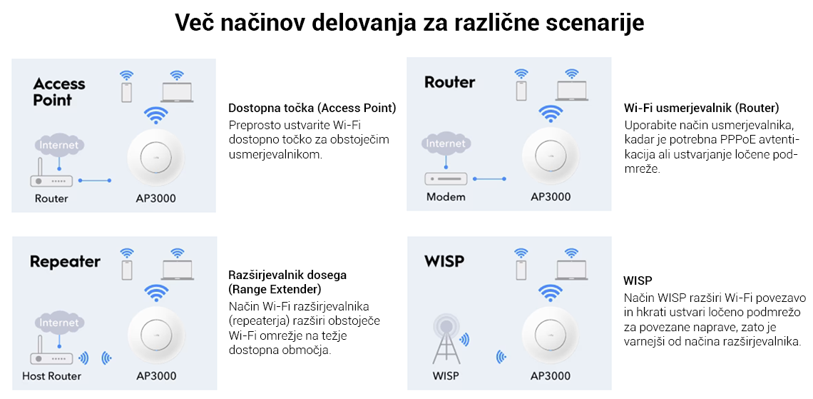 – Načini delovanja: dostopna točka (AP), Wi-Fi usmerjevalnik, ponavljalnik, WISP točka