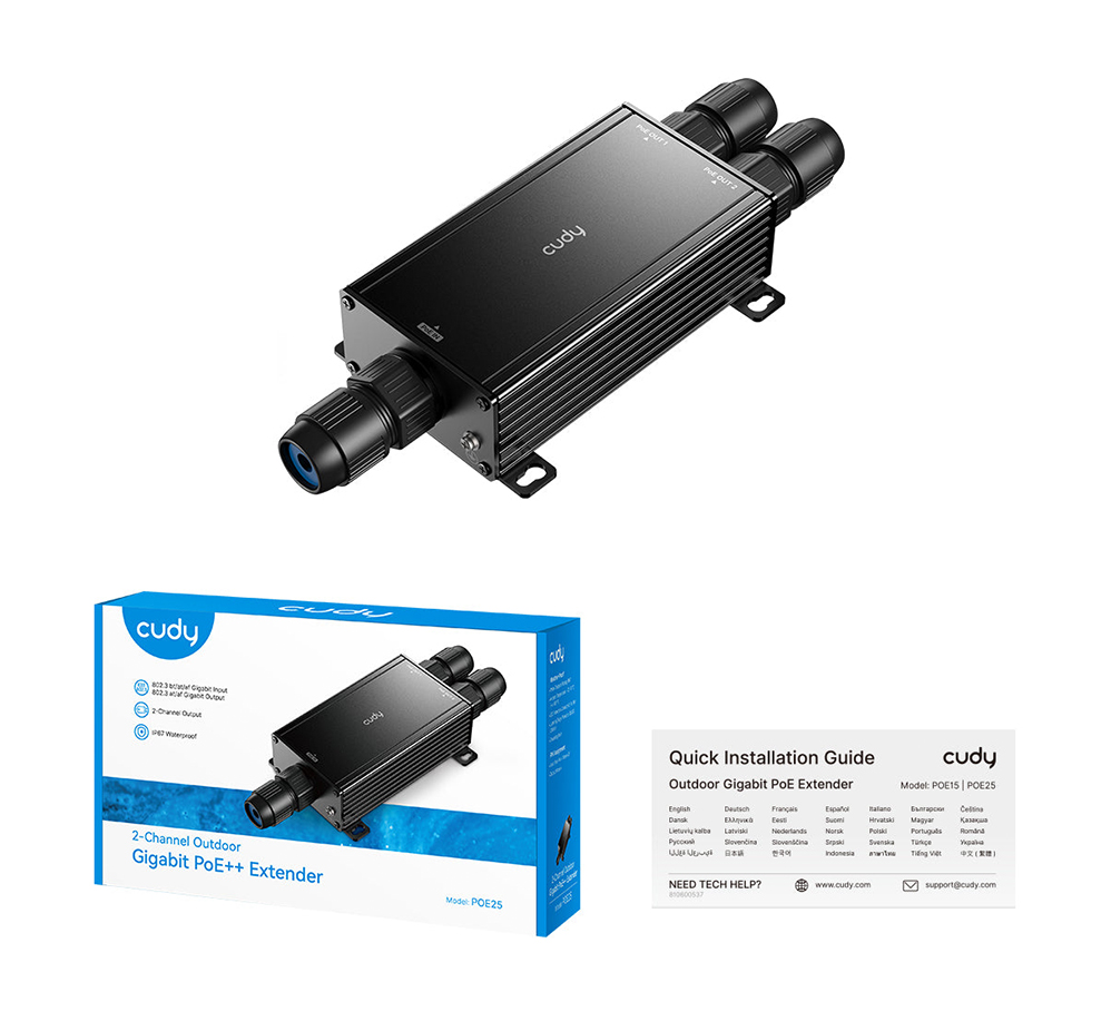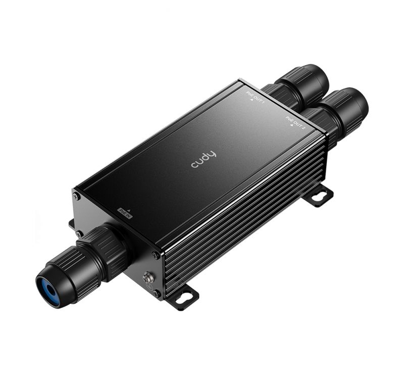 Vremensko odporen 2-kanalni PoE razširjevalnik, namenjen razširitvi dosega Ethernet in PoE povezave do dodatnih 100 m. Naprava aktivno regenerira signal in omogoča zanesljivo napajanje ter prenos podatkov tudi v zahtevnih zunanjih okoljih.
