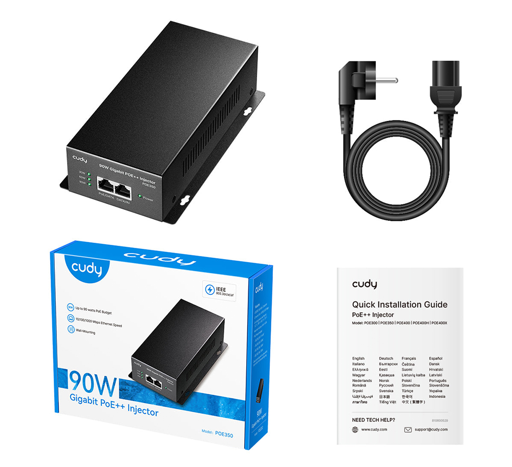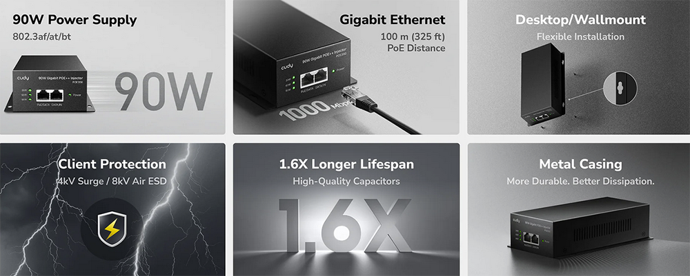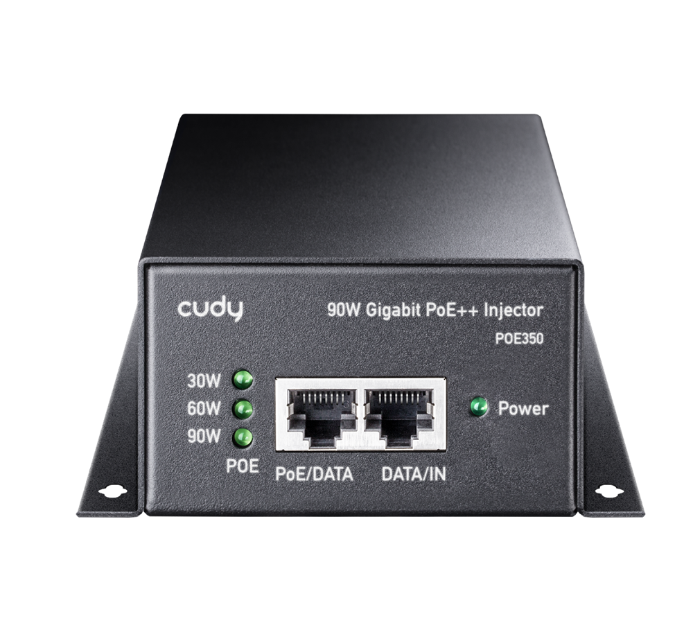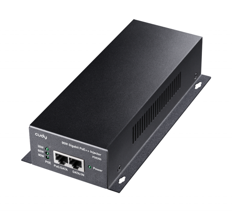 Stenski PoE napajalnik (injector) s kovinskim ohišjem za napajanje zahtevnejših PoE naprav z močjo do 90 W preko omrežnega kabla. Podpira IEEE 802.3bt/at/af (4-pair) ter omogoča gigabitni prenos do 100 m. Namenjen profesionalnim PoE kameram, dostopnim točkam in drugim visokoenergijskim PoE napravam.