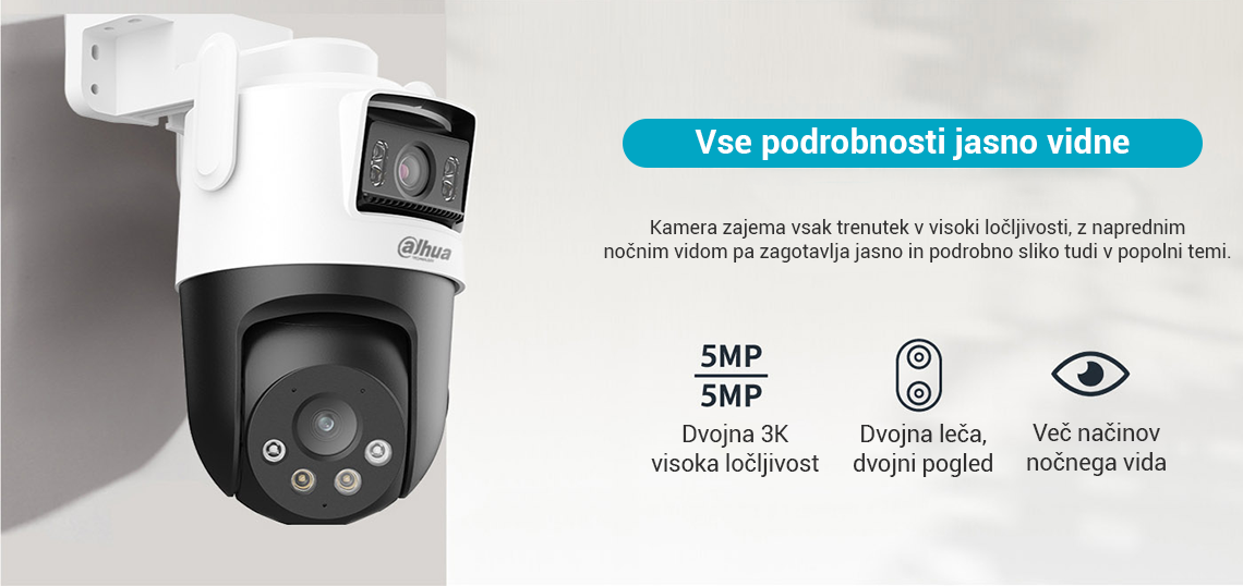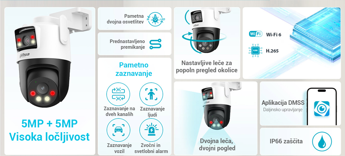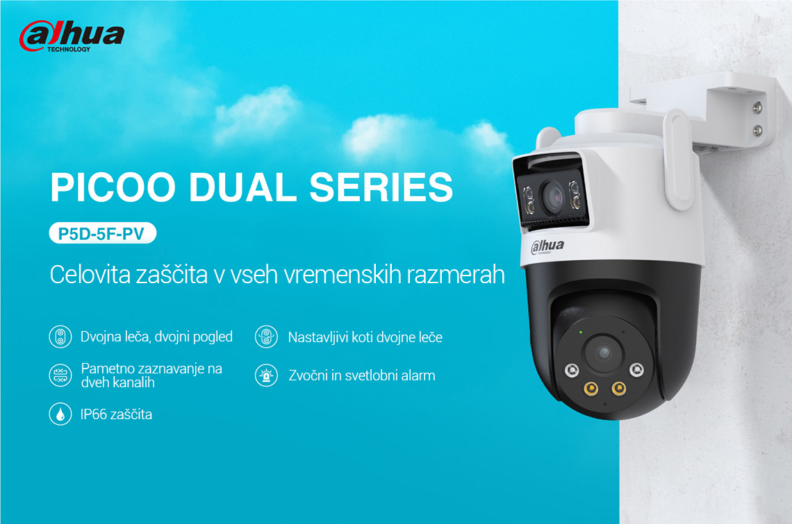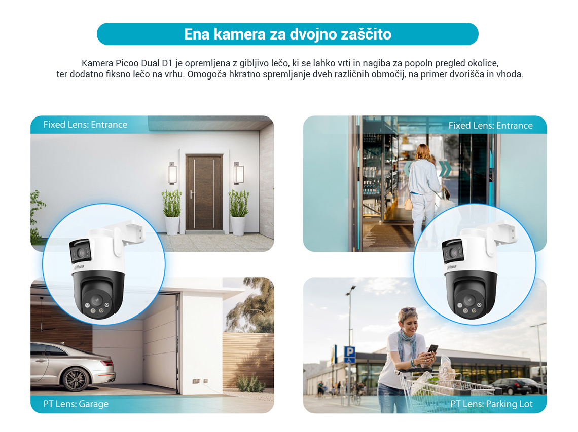 Picoo Dual Series, ki spada pod serijo Dahua Wireless, sestavljajo kamere, opremljene tako s fiksnimi lečami kot s PT lečami. Ta edinstvena kombinacija omogoča hkratno spremljanje dveh območij v živo, kar zagotavlja pokritost iz več zornih kotov. S pomočjo svojih dvojnih leč kamera izvaja pametno zaznavanje z naprednimi funkcijami, kot je AI zaznavanje ljudi in vozil, s čimer učinkovito zmanjša število lažnih alarmov. Poleg tega lahko kamera s pomočjo objektiva PT samodejno sledi premikajočim se ciljem. Kamera sproži tudi zvočne in svetlobne alarme, ko zazna vdor, ter nemudoma pošlje obvestila mobilnemu odjemalcu, da zagotovi, da ste na tekočem ne glede na to kje ste. Te kamere se pogosto uporabljajo v manjših prizorih, kot so trgovine in restavracije.