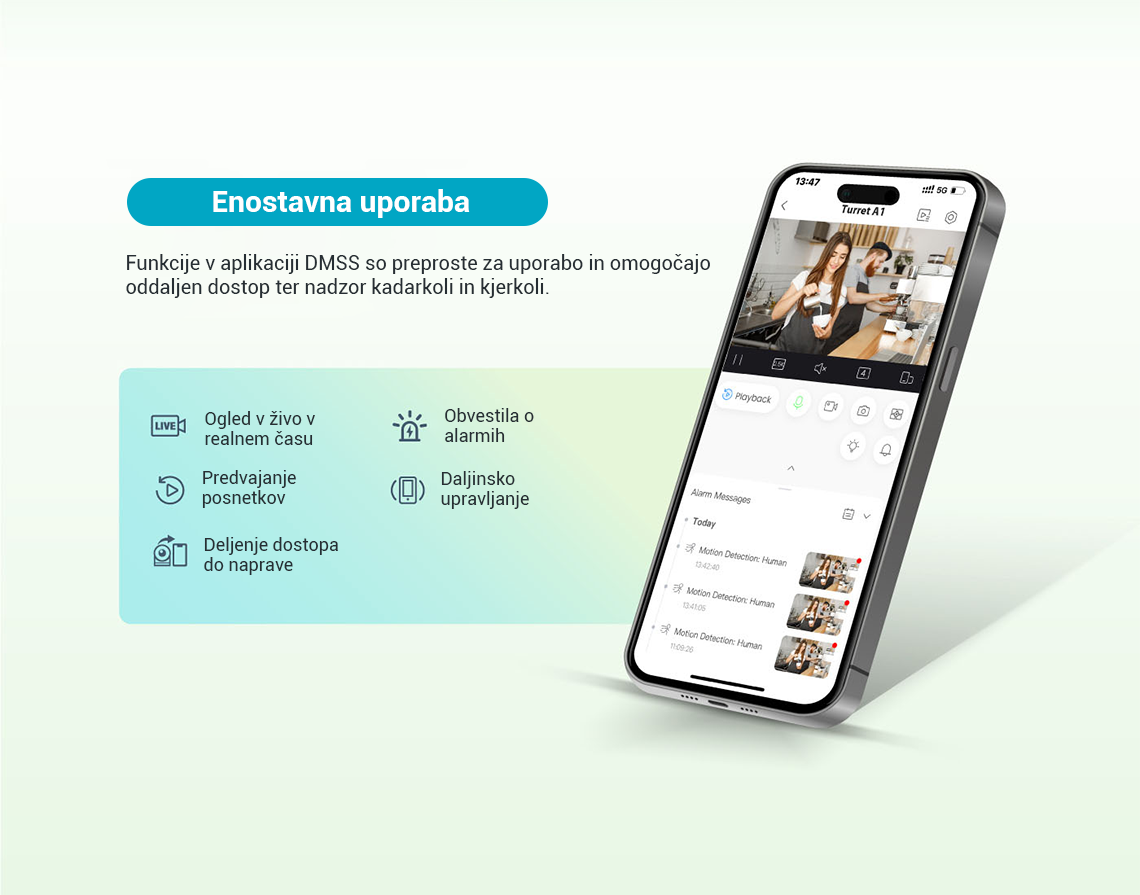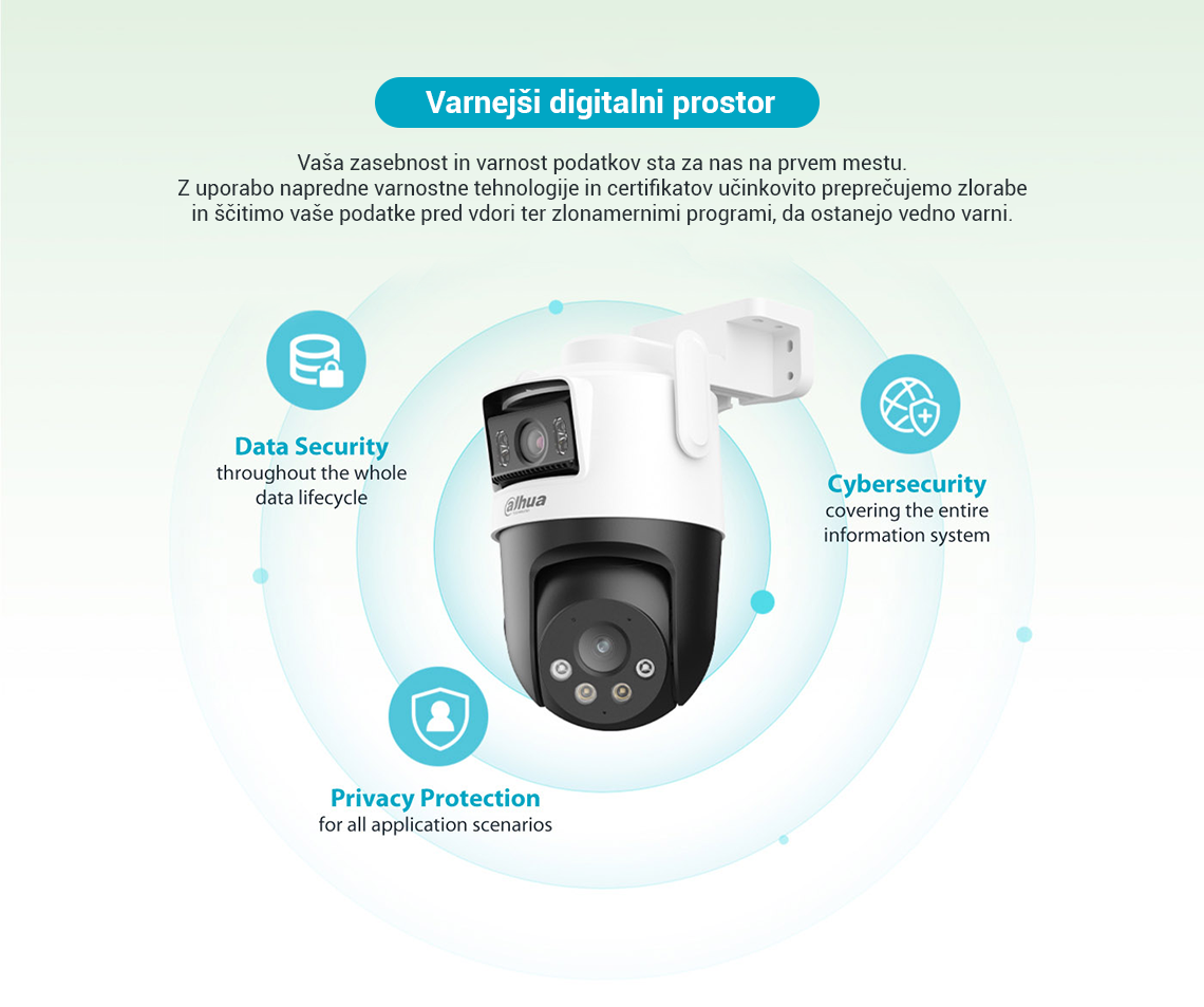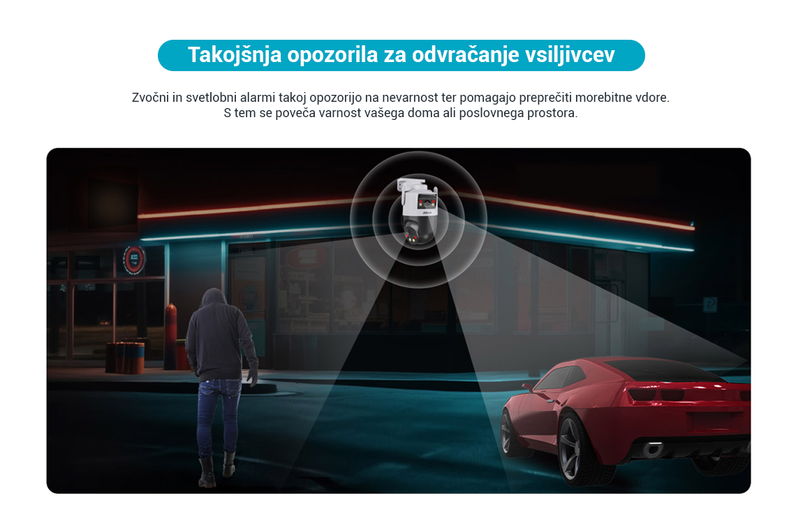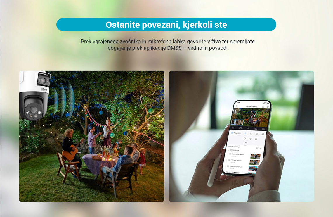 Picoo Dual Series, ki spada pod serijo Dahua Wireless, sestavljajo kamere, opremljene tako s fiksnimi lečami kot s PT lečami. Ta edinstvena kombinacija omogoča hkratno spremljanje dveh območij v živo, kar zagotavlja pokritost iz več zornih kotov. S pomočjo svojih dvojnih leč kamera izvaja pametno zaznavanje z naprednimi funkcijami, kot je AI zaznavanje ljudi in vozil, s čimer učinkovito zmanjša število lažnih alarmov. Poleg tega lahko kamera s pomočjo objektiva PT samodejno sledi premikajočim se ciljem. Kamera sproži tudi zvočne in svetlobne alarme, ko zazna vdor, ter nemudoma pošlje obvestila mobilnemu odjemalcu, da zagotovi, da ste na tekočem ne glede na to kje ste. Te kamere se pogosto uporabljajo v manjših prizorih, kot so trgovine in restavracije.