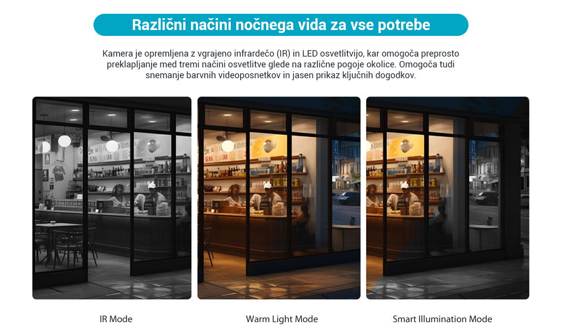 Razdalja osvetlitve: Do 30 m (IR); Do 20 m (topla svetloba)