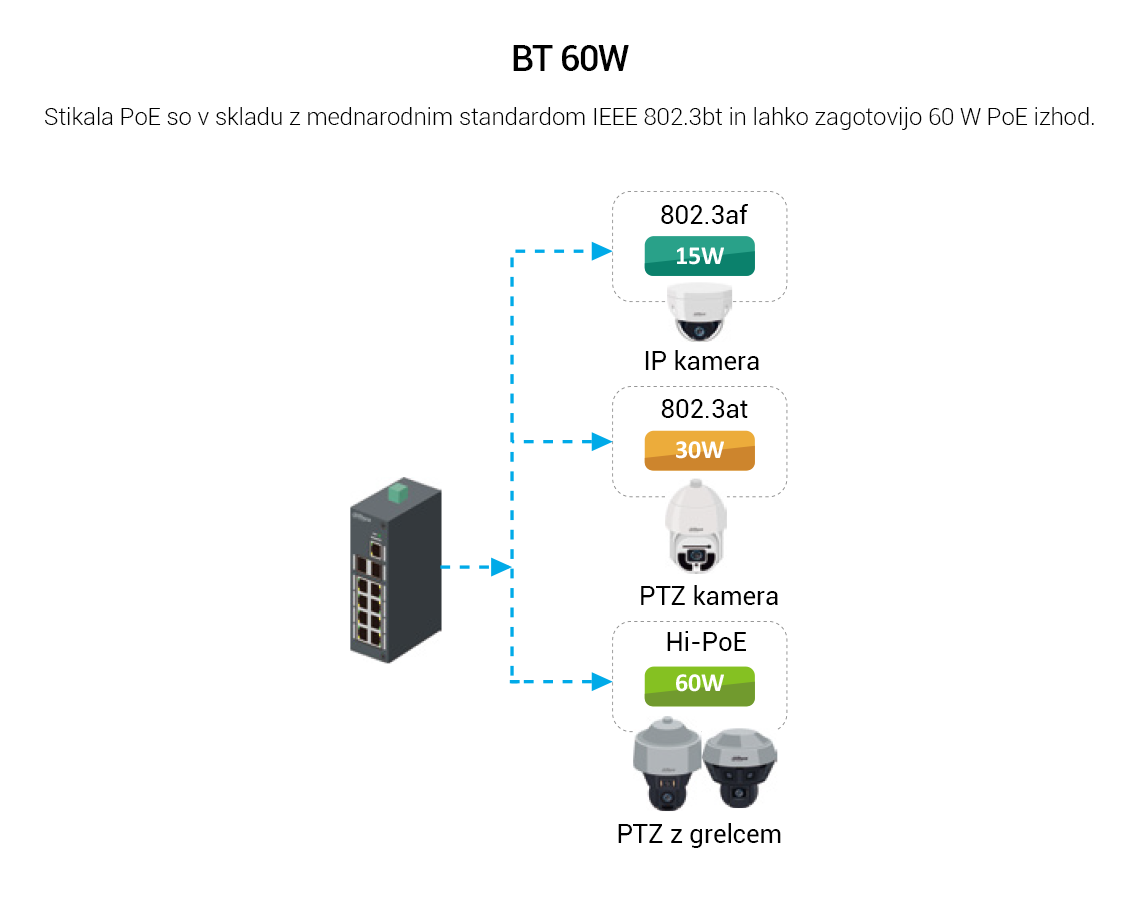 PoE moč: Port1≤60W, Port2-4≤30W, Total≤60W