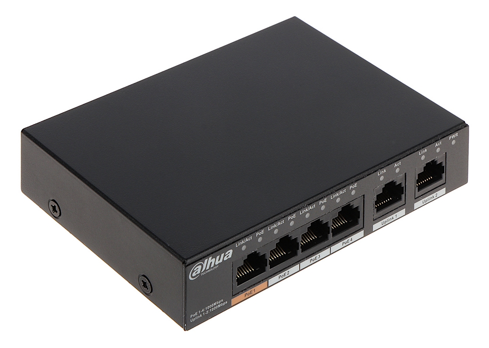 Ethernet port: 1-4:4 × RJ45 10/100/1000 Mbps (PoE); 5-6:2 × RJ45 10/100/1000 Mbps (uplink)