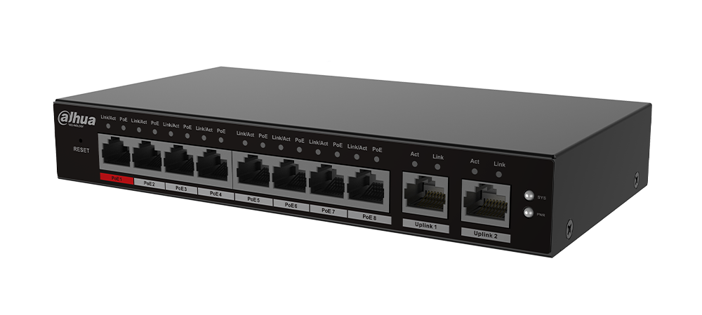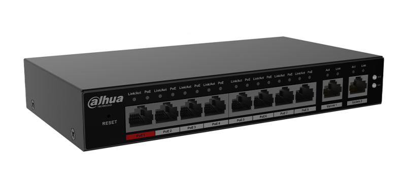 PoE moč: Vrata 1–8: 8 × RJ-45 10/100 M; Uplink 1–2: 2 × RJ-45 10/100/1000 M