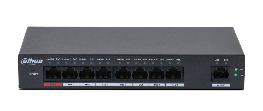 PoE moč: Vrata 1–8: 4 × RJ-45 10/100/1000 Mbps; Uplink 1: 1 × RJ-45 10/100/1000 Mbps