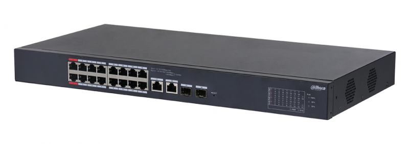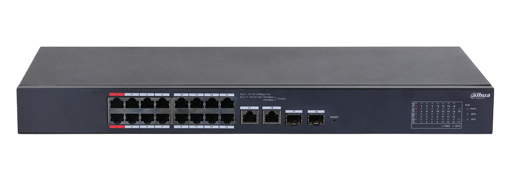 Opis funkcijskih rež: Vrata 1-16: 16 × RJ-45 10/100 Mbps (PoE); Vrata 17-18: 2 × RJ-45 10/100/1000 Mbps (kombinirano); Vrata 17-18: 2 × SFP 1000 Mbps (kombinirano)