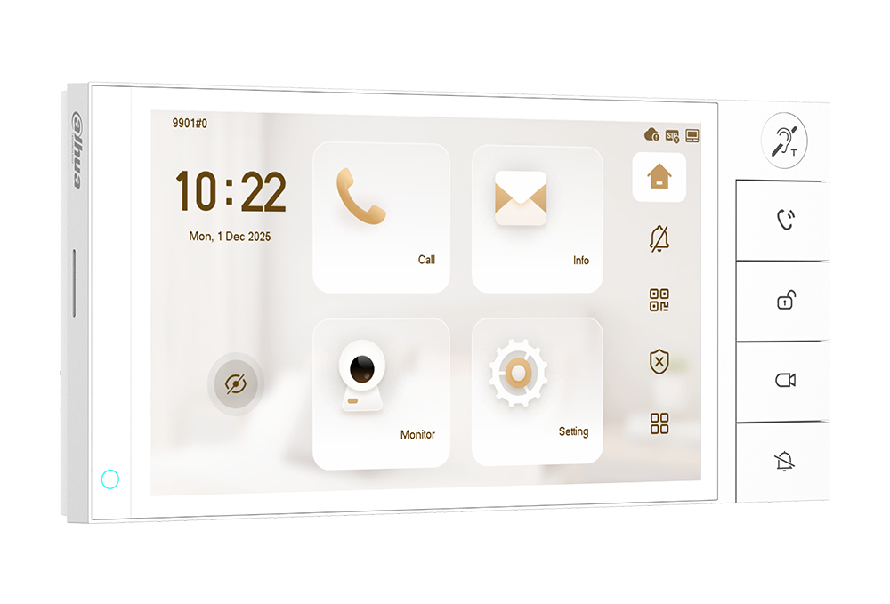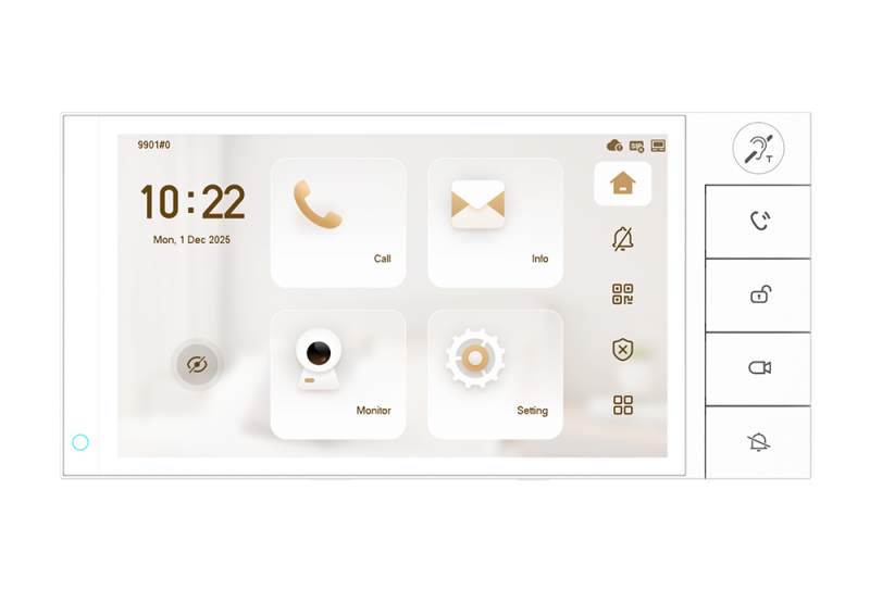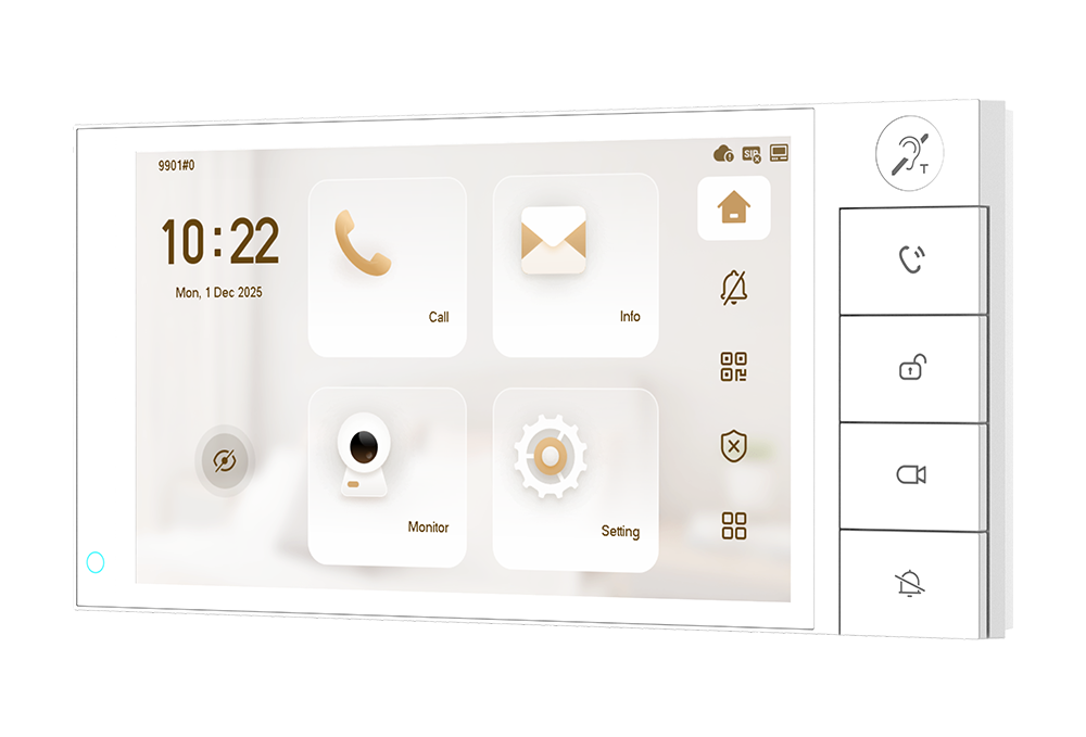 Pameten 7" notranji monitor, zasnovan za sodobne domofonske sisteme, ki združuje eleganten dizajn, enostavno uporabo in izjemno prilagodljivost. Deluje prek IP, Wi-Fi ali 2-žične povezave, zato je idealen tako za nove inštalacije kot nadgradnje obstoječih sistemov.
