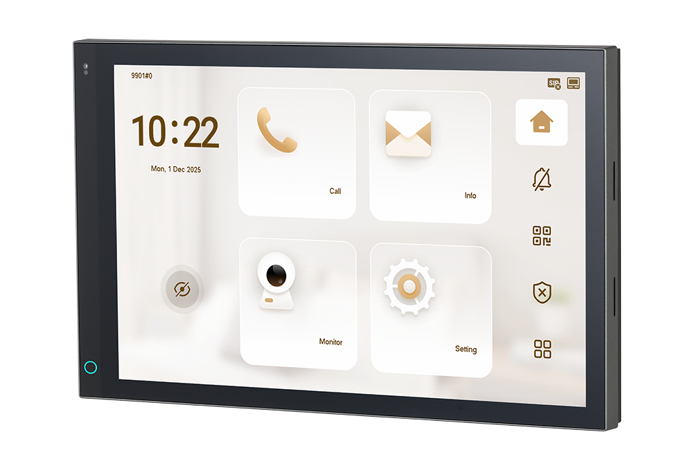 Eleganten 10,1" notranji monitor z zaslonom na dotik, ki združuje sodoben dizajn, enostavno uporabo in zanesljivo povezljivost prek IP ali Wi-Fi. Velik IPS zaslon zagotavlja jasno sliko in odlično uporabniško izkušnjo, medtem ko dvosmerni zvok omogoča hitro komunikacijo z obiskovalci.