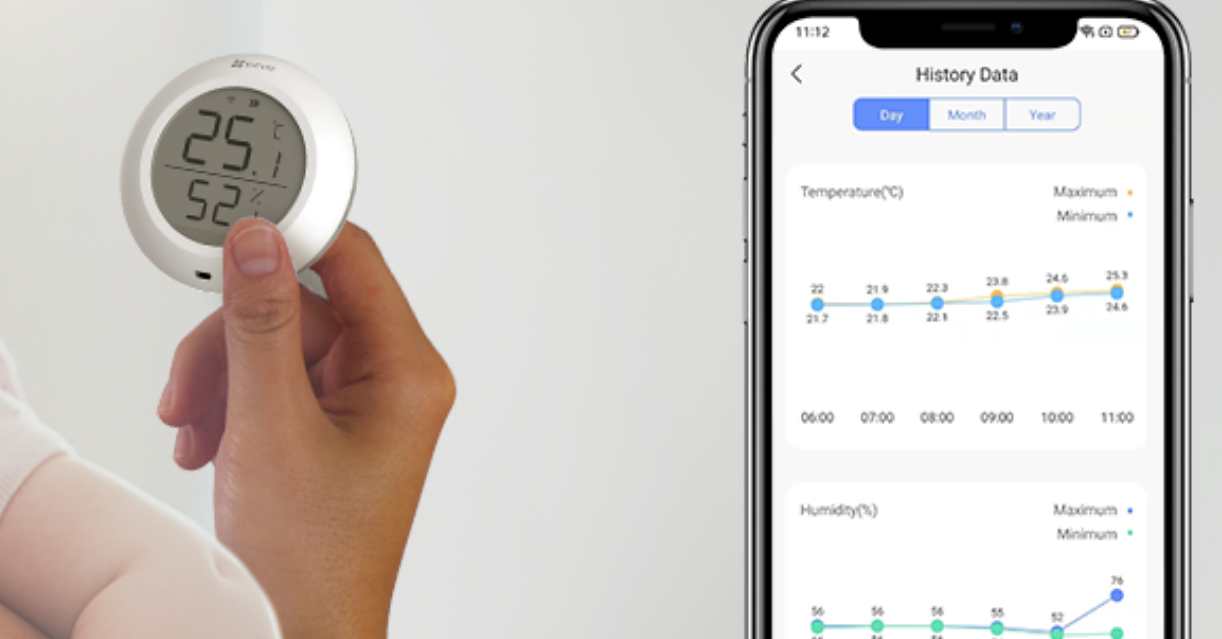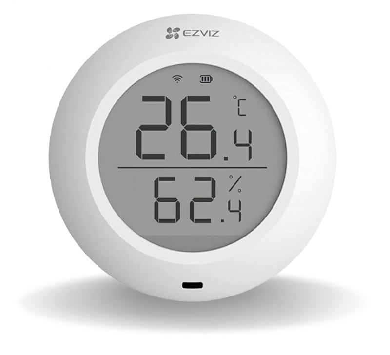 Kot majhen pripomoček z visoko natančnim senzorskim čipom T51C zaznava in vizualizira sobno temperaturo in vlažnost na svojem velikem zaslonu. Ko ga povežete z EZVIZ centralno enoto, lahko tudi preverite podatke v realnem času ali pregledate zgodovino v aplikaciji EZVIZ tudi ko niste doma.