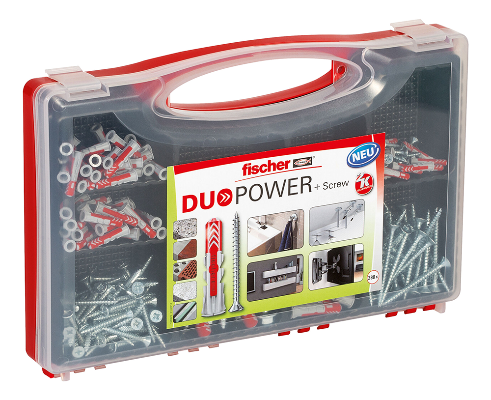 fischer DuoPower – set z vložki in vijaki (280 kosov) Praktičen komplet najpogosteje uporabljenih vložkov DuoPower in pripadajočih vijakov v kakovostni škatli. Predhodno razvrščeni premeri omogočajo hitro izbiro brez iskanja. Prozoren pokrov omogoča hiter pregled nad vsebino. Škatla je trpežna in primerna za ponovno polnjenje. Prednosti: