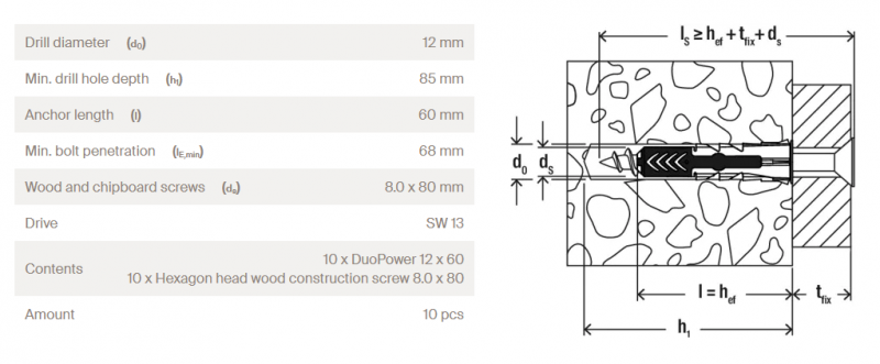 Vsebina: 10 x DuoPower 12 x 60; 10 x šesterorobi varnostni vijak 8,0 x 80