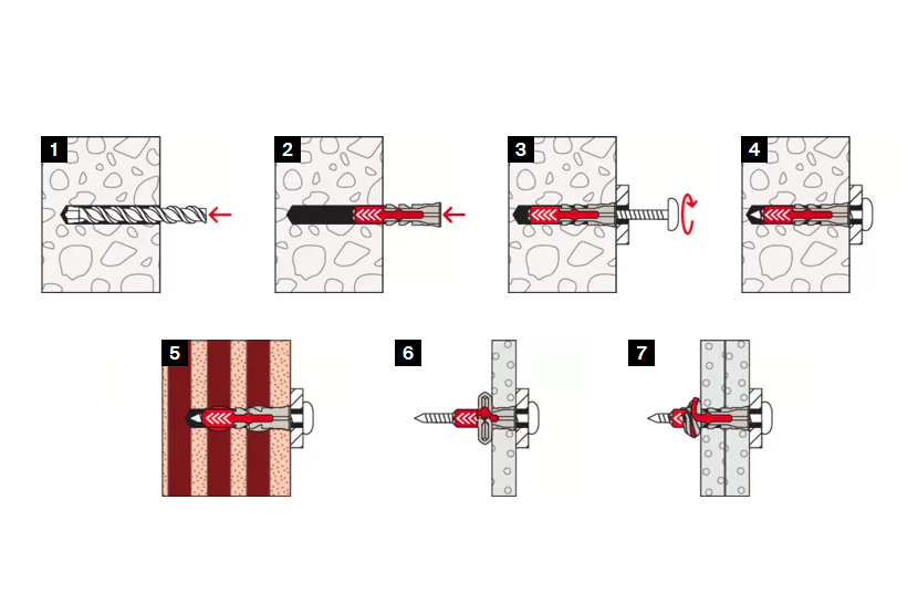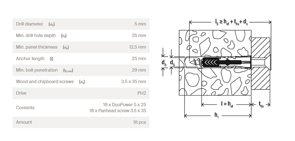 • Večja sidrna globina modelov DuoPower 6 x 50, 8 x 65 in 10 x 80 omogoča uporabo v votlih gradbenih materialih, poroznem betonu in za premostitev ometa.