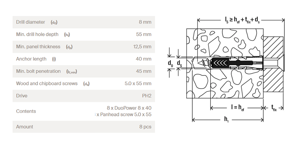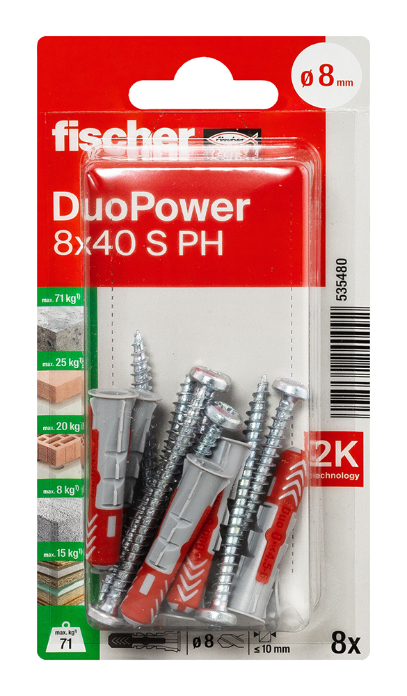 • Večja sidrna globina modelov DuoPower 6 x 50, 8 x 65 in 10 x 80 omogoča uporabo v votlih gradbenih materialih, poroznem betonu in za premostitev ometa.
