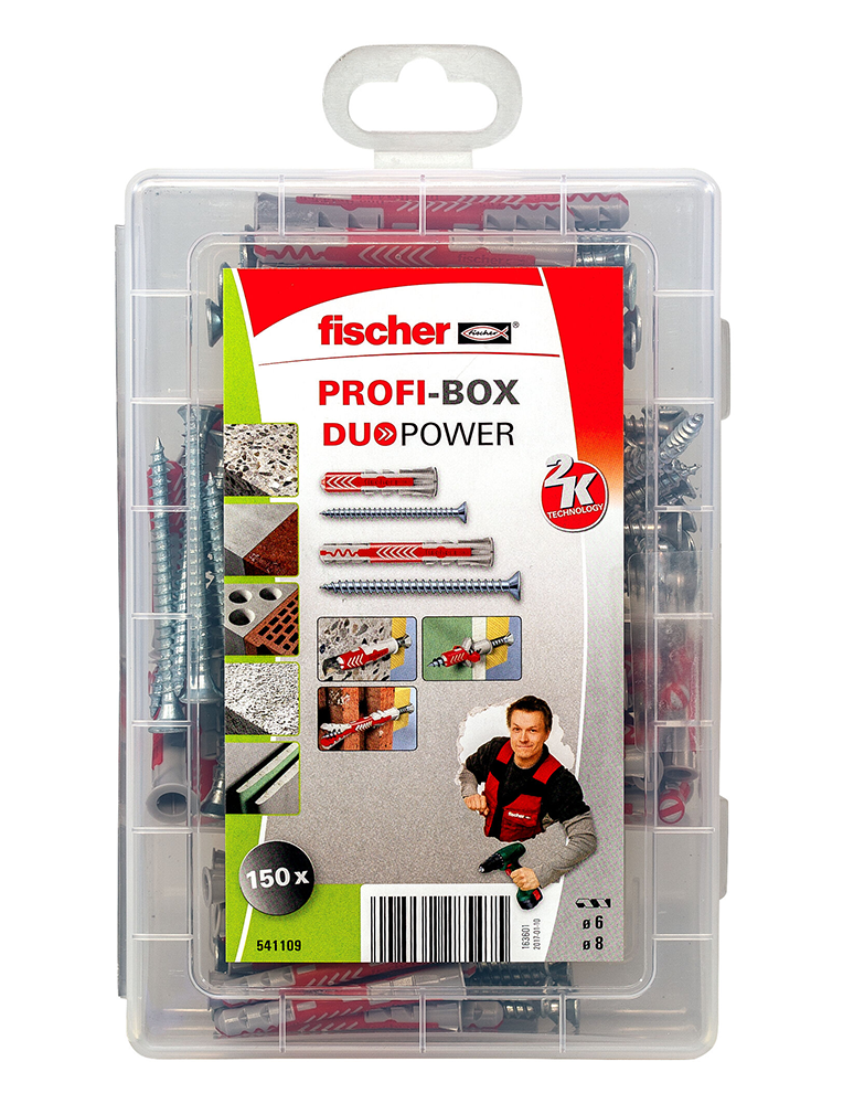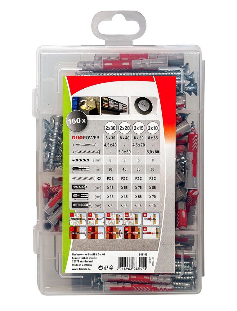 Fischer DuoPower dosega zelo dobre vrednosti oprijema zaradi svojih dveh komponent: glede na gradbeni material sivi del iz visokokakovostnega najlona samodejno aktivira optimalno funkcijo izdelka (raztezanje, pregibanje, vozlanje) za najboljši oprijem. Raztezna krilca rdeče komponente podpirajo varno raztezanje in dodatno povečujejo varnost sive komponente. Vijaka ni mogoče prekomerno zategniti. Predoblikovan rob na glavi vložka preprečuje zdrs vložka v vrtino.