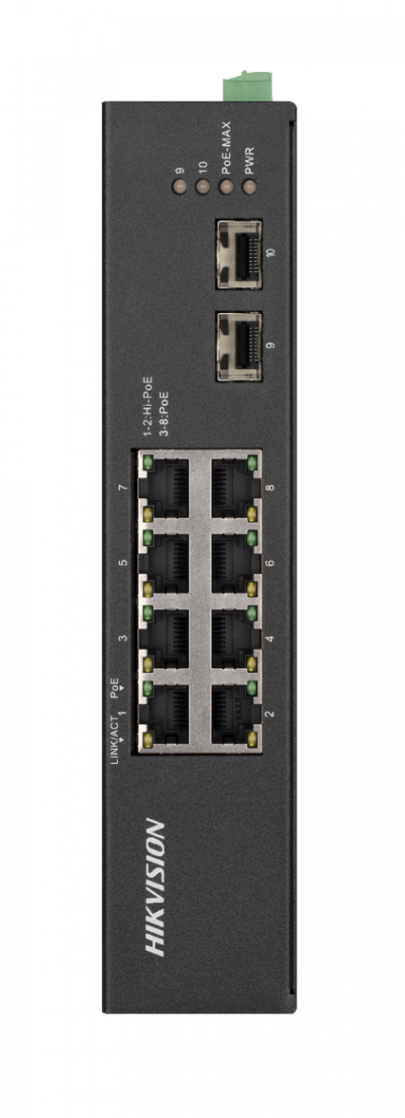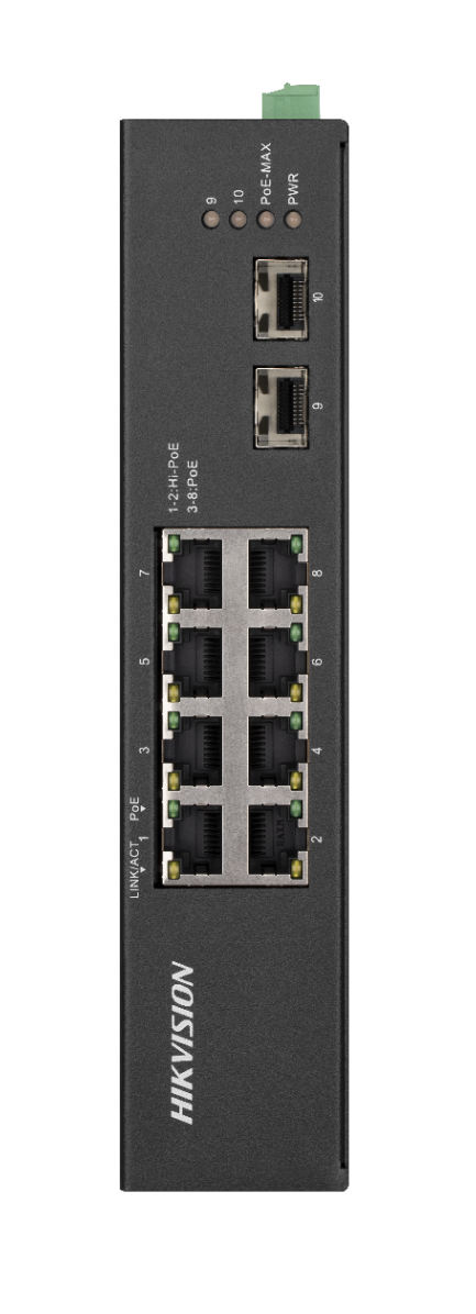 - 6 × gigabitna vrata PoE RJ45, 2 × gigabitna vrata Hi-PoE RJ45 in 2 × gigabitna optična vrata SFP