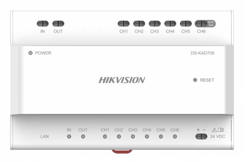 Naprava ima 6 2-žičnih glavnih vodov za priklop monitorjev in zunanjih panelov (napajanje in prenos signala) ter 1 vtičnico Ethernet za priklop omrežja LAN. Poleg tega je en izmed portov prilagojen za napajanje obsežne postaje za upravljanje vstopnih vrat z maks. porabo moči 16W. Poleg tega je switch opremljen z dodatnimi izhodi dvožičnega glavnega voda, namenjenimi za kaskadno povezavo z DS-KAD706-S.