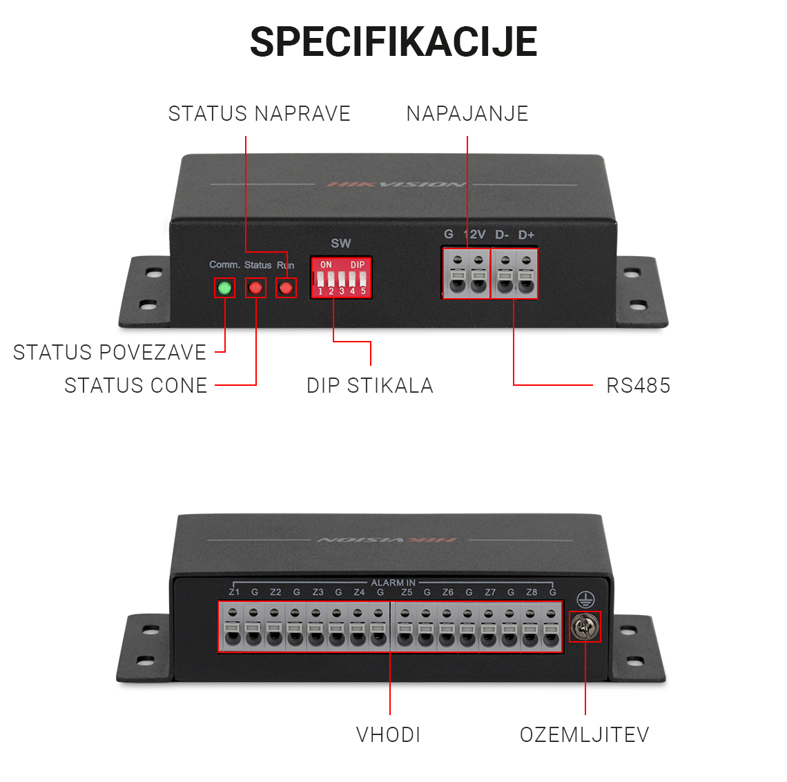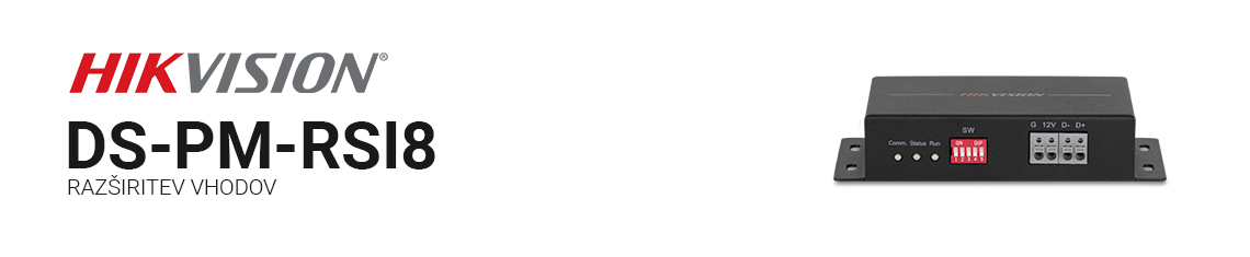 DS-PM-RSI8 je RS485 razširitev vhodov z 8 vhodi, ki se uporablja na varnostni nadzorni plošči prek RS-485. Podpira normalno odprte (NO) ter normalno zaprte (NC) senorje, z zaljučnimi upori 2.2K/3.3K/5.6K/8.2K. Podpira sabotažni alarm samo z 2.2K zaključnimi upori (EOL).