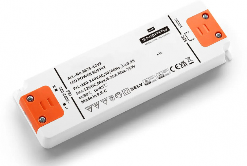 Napajalnik SS75-12VF proizvajalca Snappy, je namenjen predvsem napajanju LED trakov, LED žarnic, LED sijalk, LED modulov in ostalih LED svetil, ki za delovanje potrebujejo napajanje s konstantno napetostjo. Snappy kompaktni napajalniki za LED so zaradi oblike in kompaktnih dimenzij primerni za vgradnjo v najrazličnejša ohišja, kjer je pomanjkanje prostora. Zaradi ustreznosti varnostnim standardom jih lahko montiramo tudi neposredno na leseno pohištvo in druge vnetljive materiale.