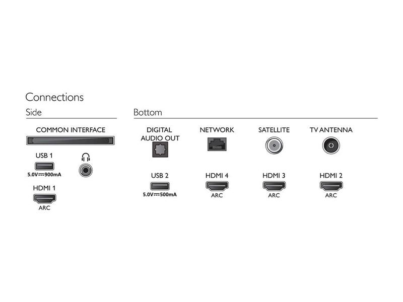 - Ostali priključki: Satelitski priključek, Standardni vmesnik plus (CI+), Digitalni avdio izhod (optični), Ethernet-LAN RJ-45, Izhod za slušalke, Storitveni priključek