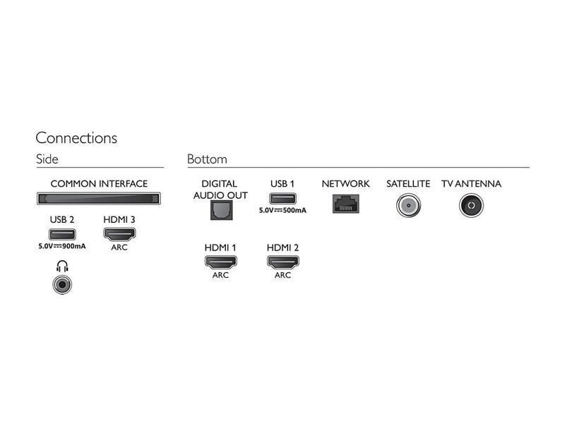 - Ostali priključki: Satelitski priključek, Standardni vmesnik plus (CI+), Digitalni avdio izhod (optični), Ethernet-LAN RJ-45, Izhod za slušalke, Storitveni priključek