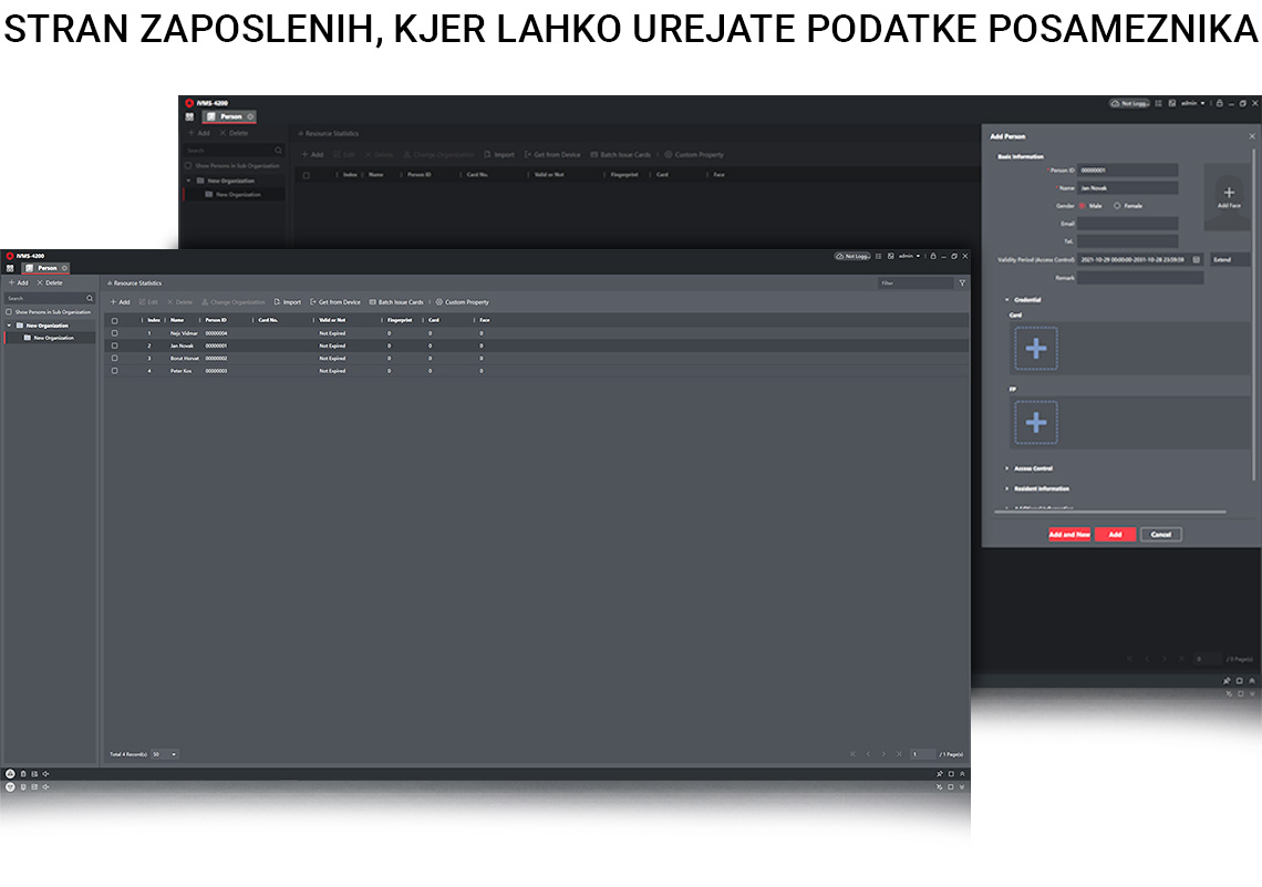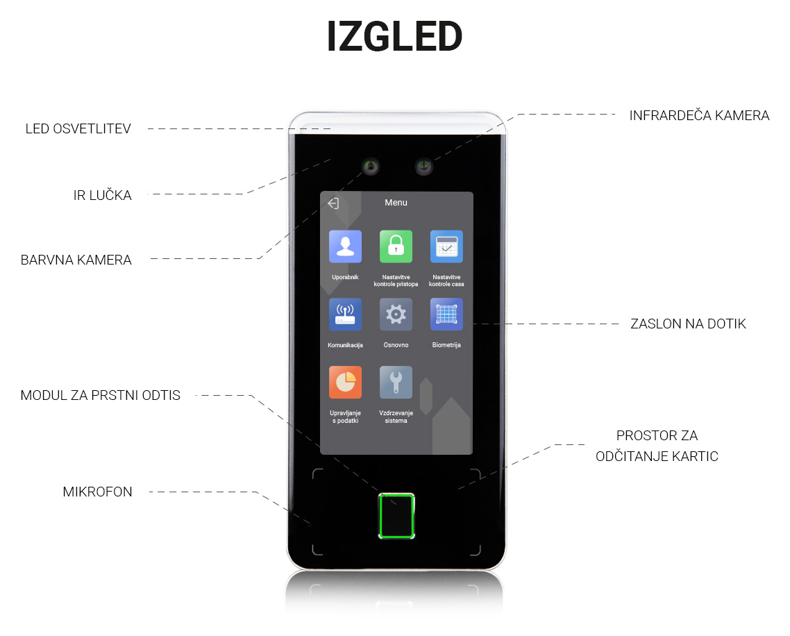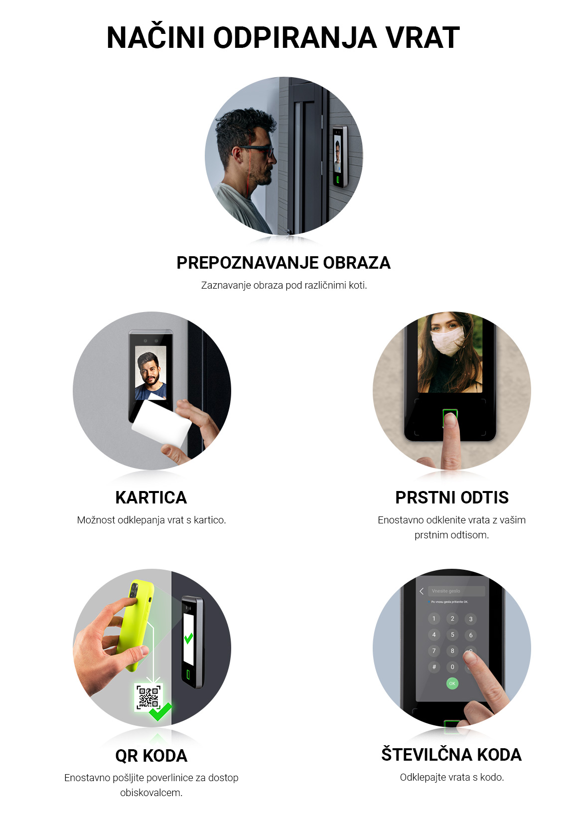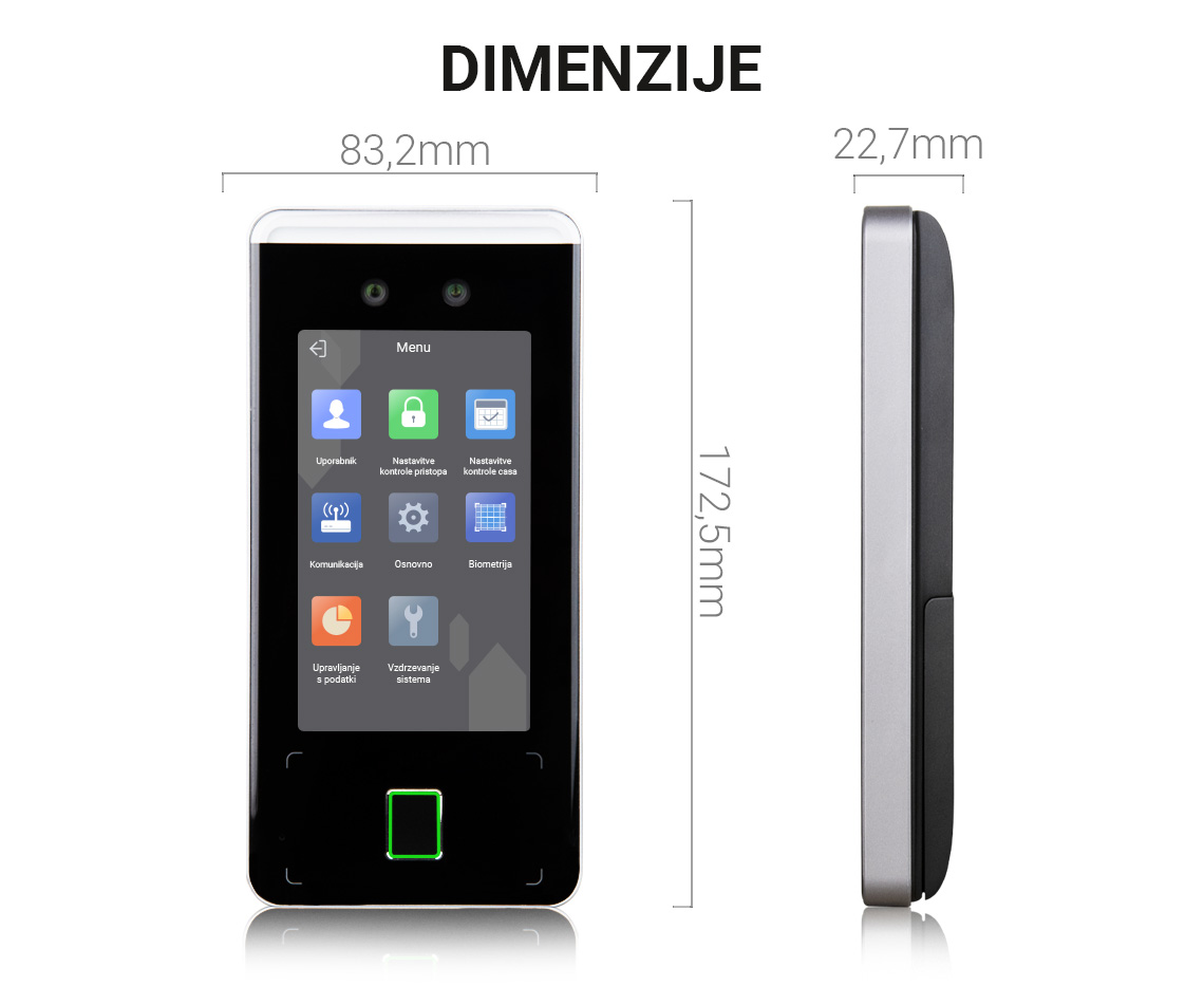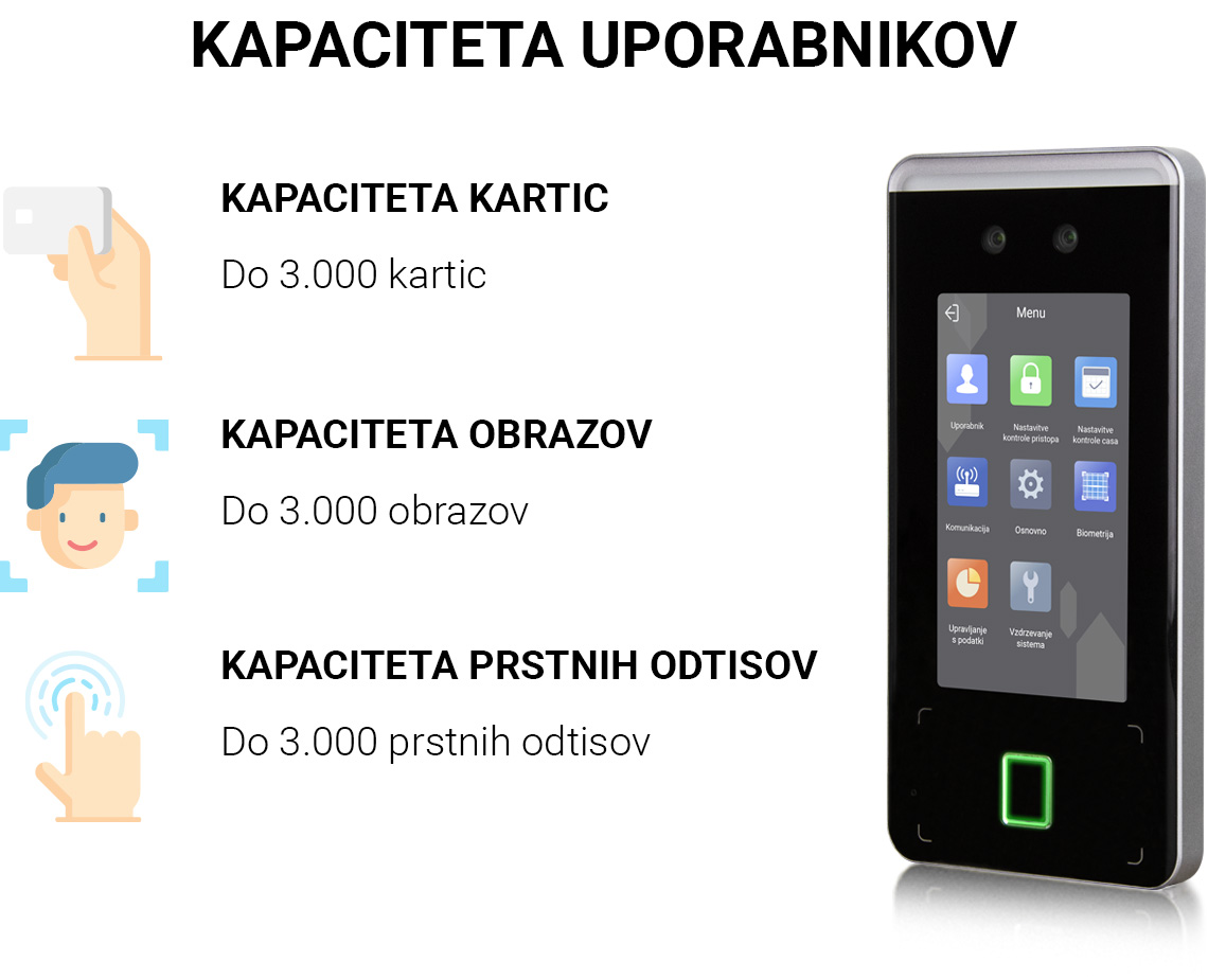 - Največ 3000 obrazov, največ 3000 prstnih odtisov in največ 3000 kartic
