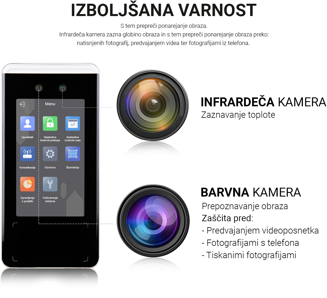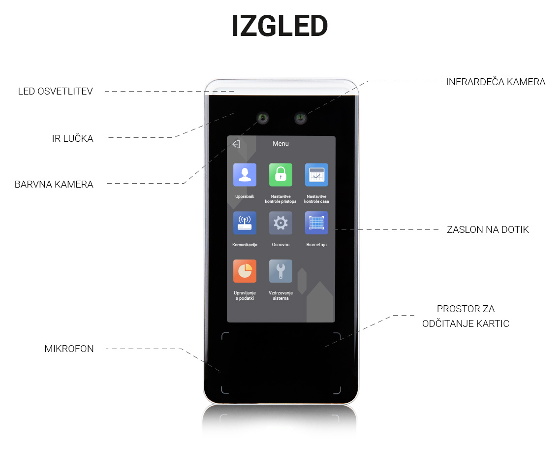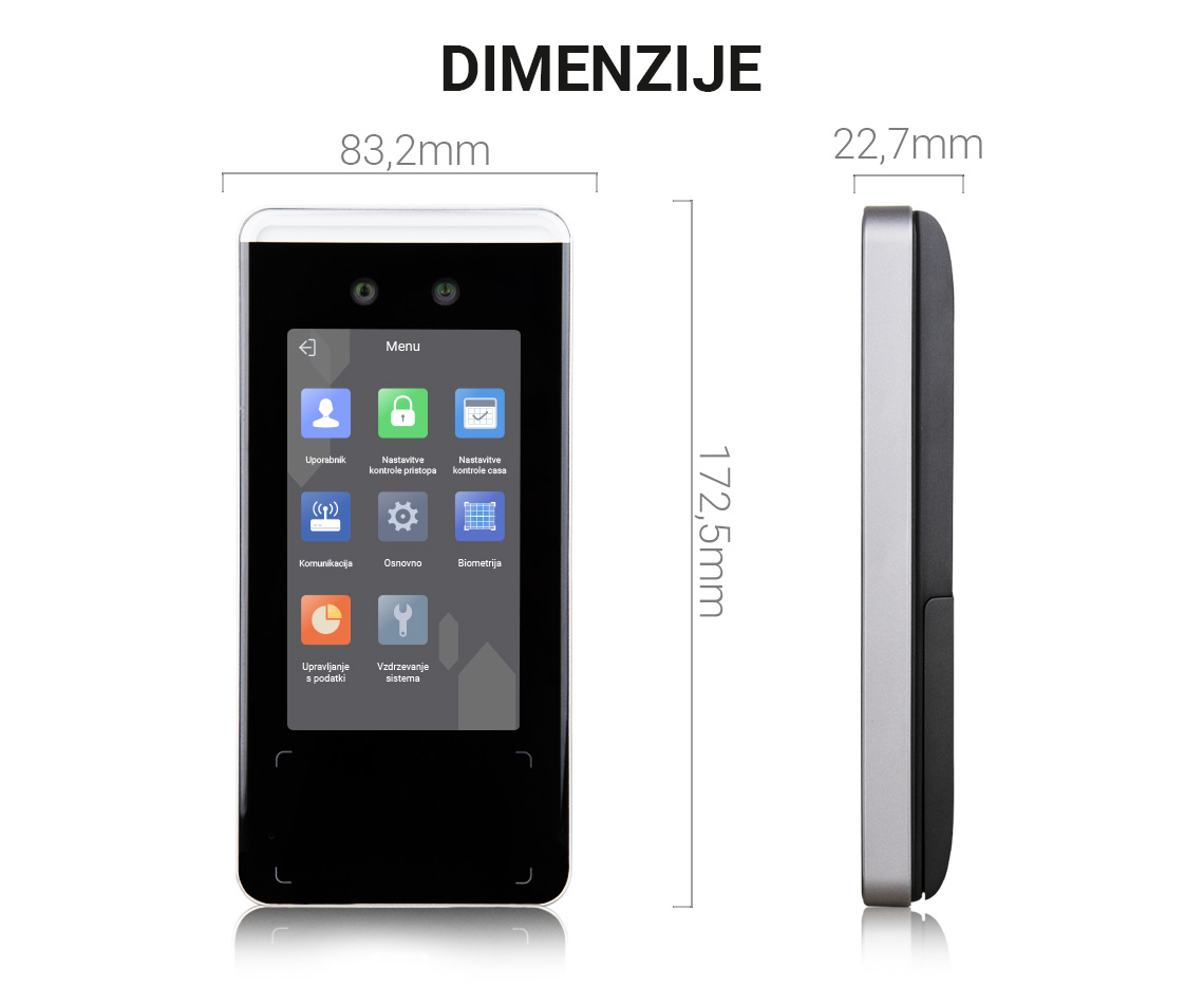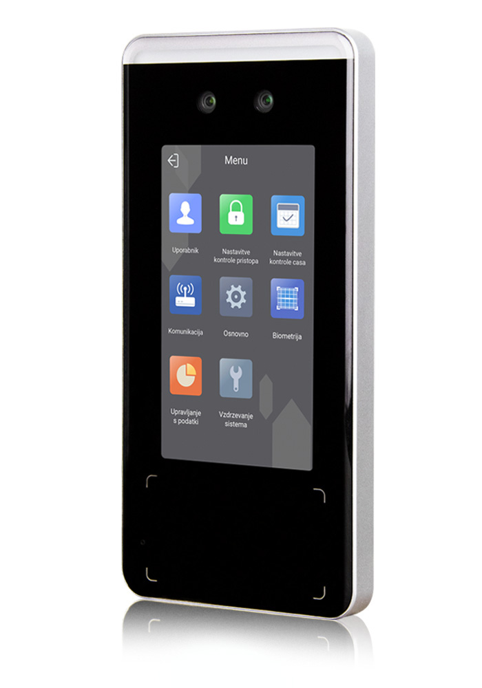 - Terminal za prepoznavanje obrazov, 4,3-palčni LCD zaslon na dotik, širokokotna leča z ločljivostjo 2 milijona slikovnih pik, vgrajen bralni modul Mifare