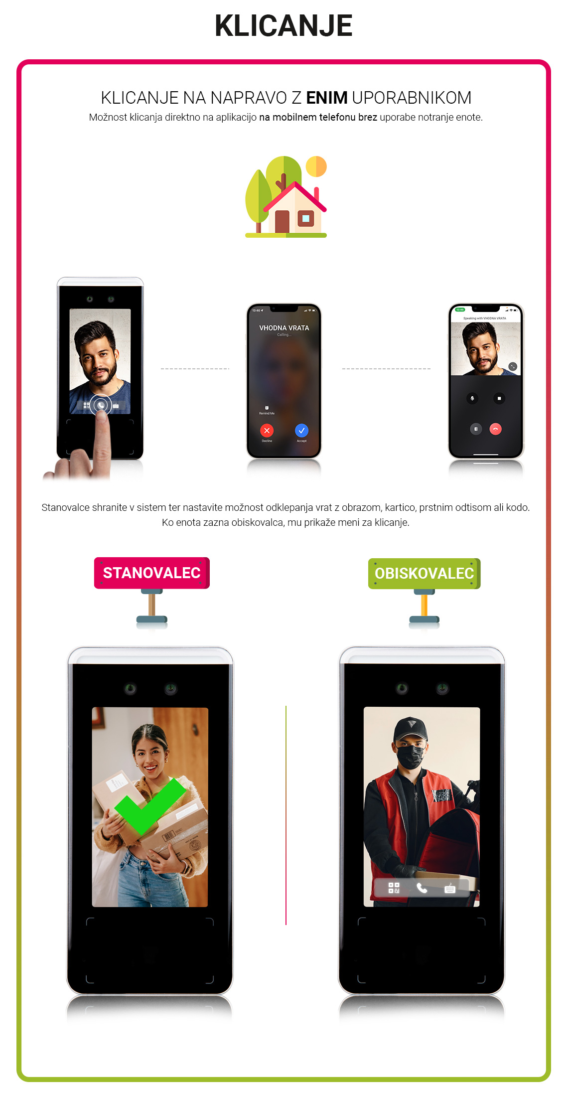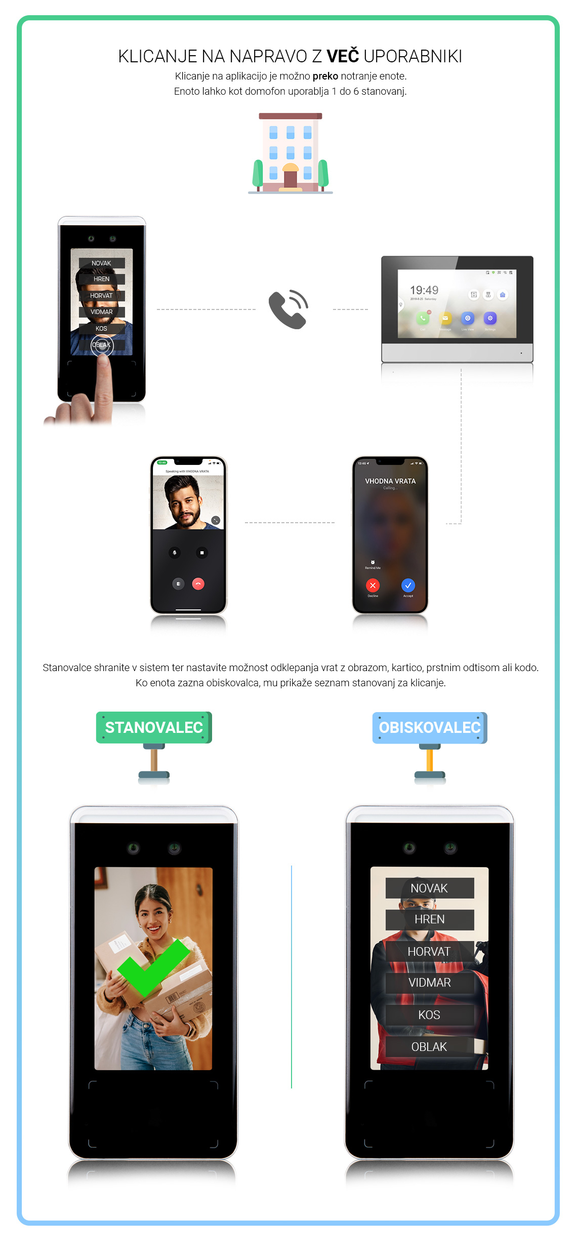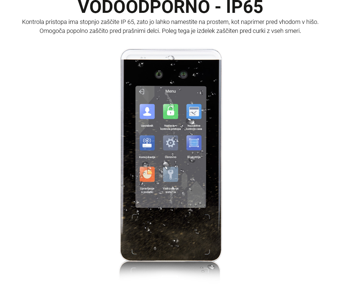 - Terminal za prepoznavanje obrazov, 4,3-palčni LCD zaslon na dotik, širokokotna leča z ločljivostjo 2 milijona slikovnih pik, vgrajen bralni modul Mifare