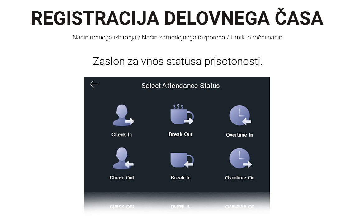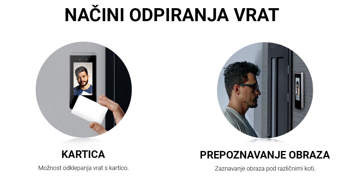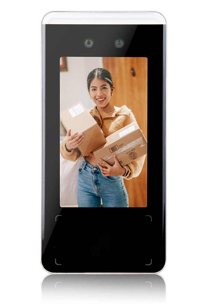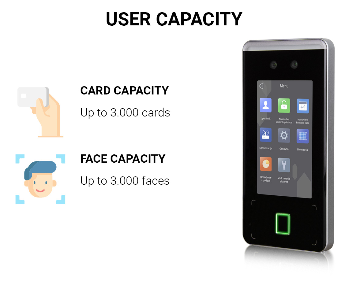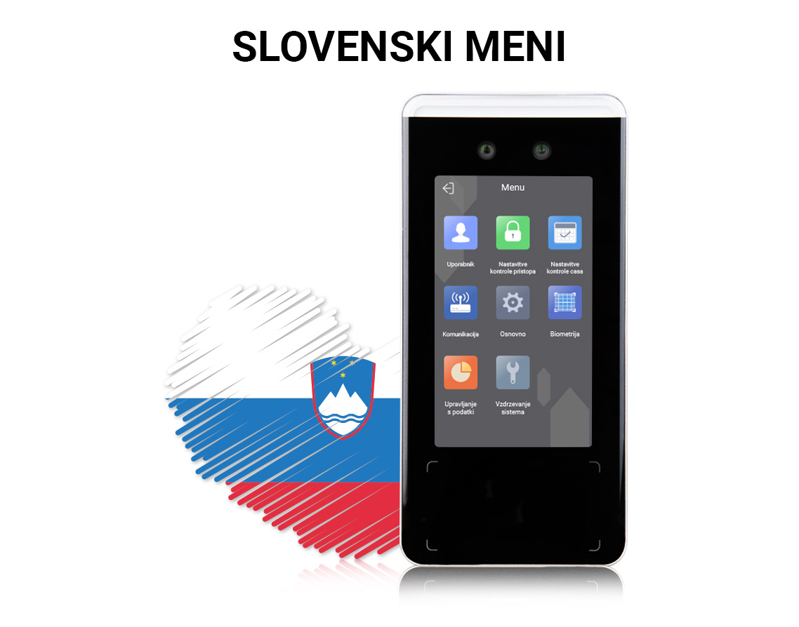 - Terminal za prepoznavanje obrazov, 4,3-palčni LCD zaslon na dotik, širokokotna leča z ločljivostjo 2 milijona slikovnih pik, vgrajen bralni modul Mifare
