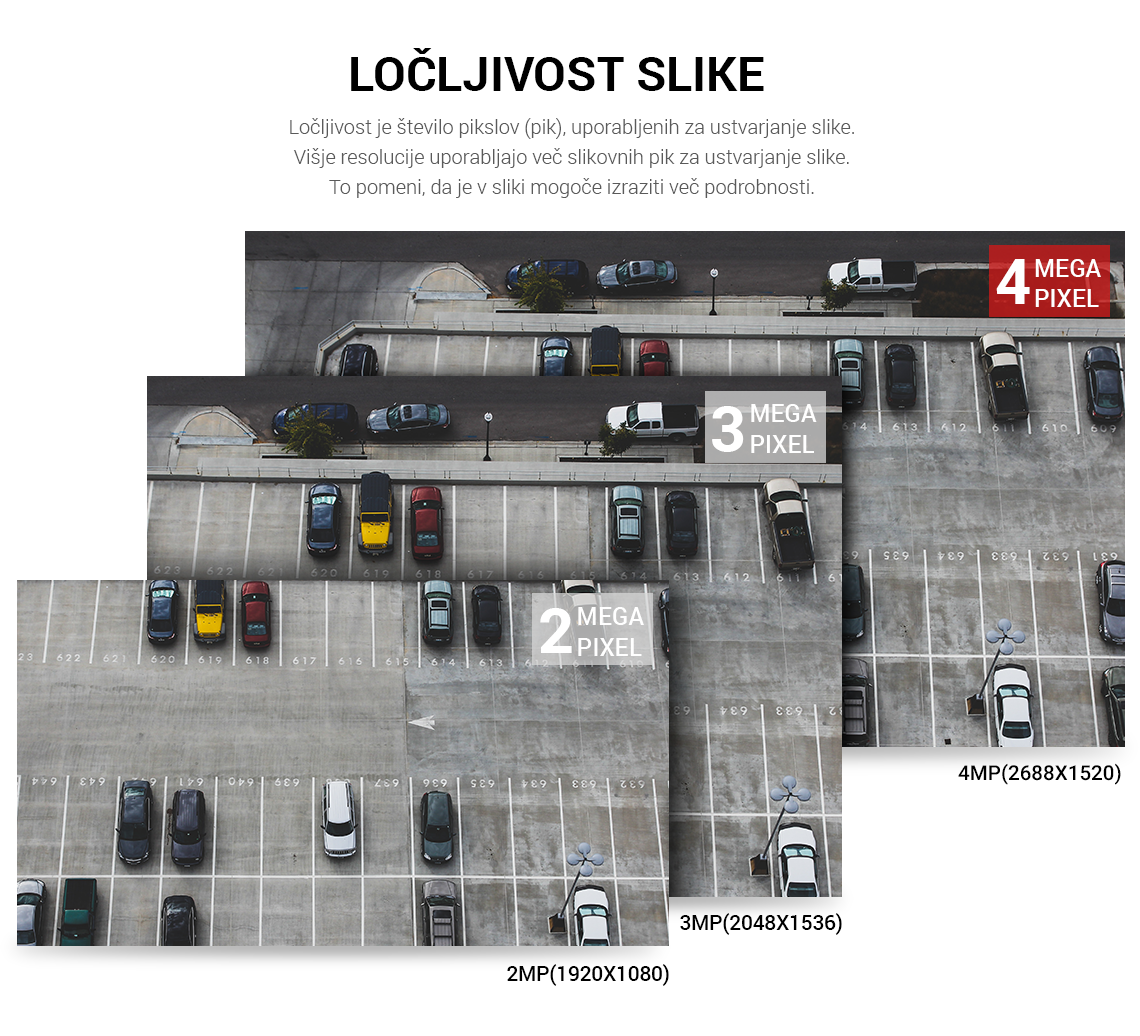 Ločljivost: 2688 × 1520 (2688 × 1520); 2560 × 1440 (2560 × 1440); 3M (2048 × 1536); 2304 × 1296 (2304 × 1296); 1080p (1920 × 1080); 1,3 M (1280 × 960); 720p (1280 × 720); D1 (704 × 576/704 × 480); VGA (640 × 480); CIF (352 × 288/352 × 240)