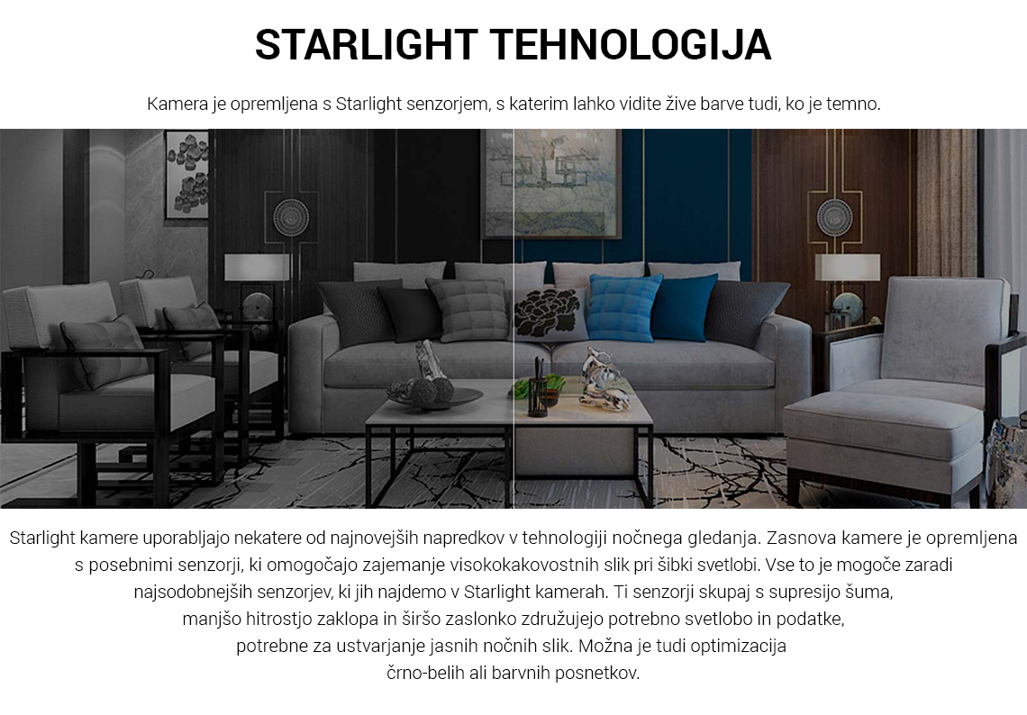• Minimalna osvetlitev v barvnem načinu 0.005 Lux F1.5 (serija Starlight omogoča barvno sliko pri slabi osvetlitvi )