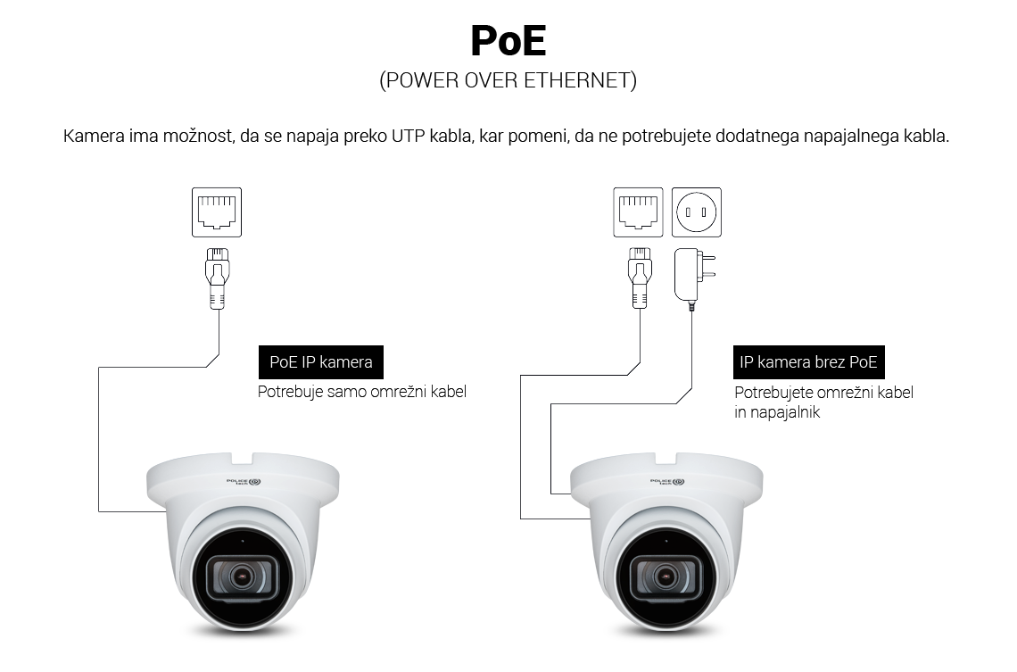 • PoE omogoča napajanje preko UTP kabla, kar pomeni , da ne potrebujemo dodatnega napajalnega kabla
