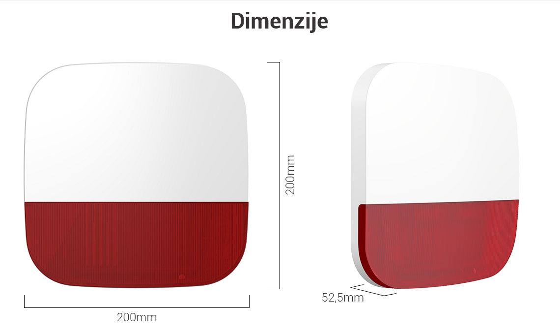 Mere izdelka: 200 mm × 200 mm × 52,5 mm (D × Š × V)
