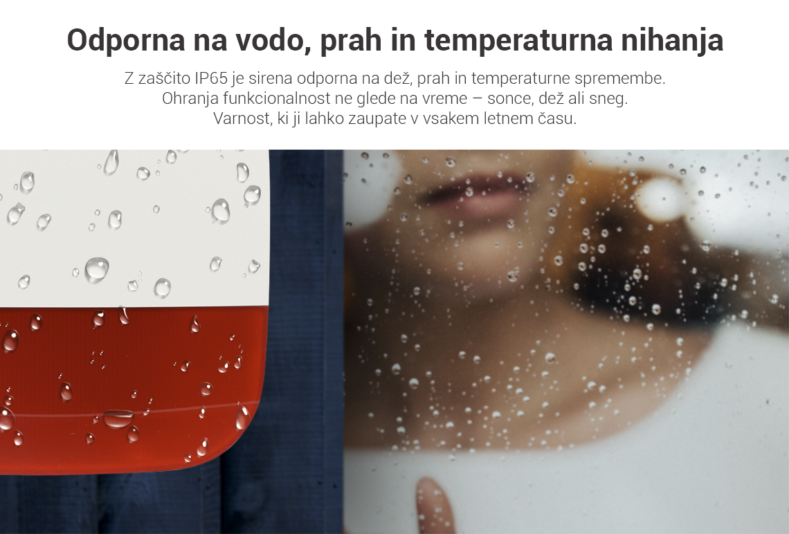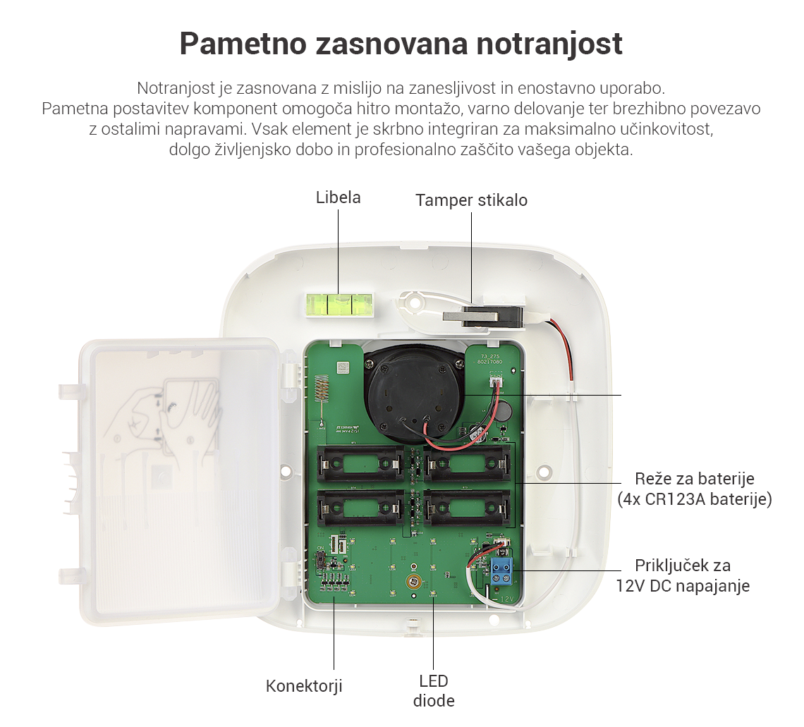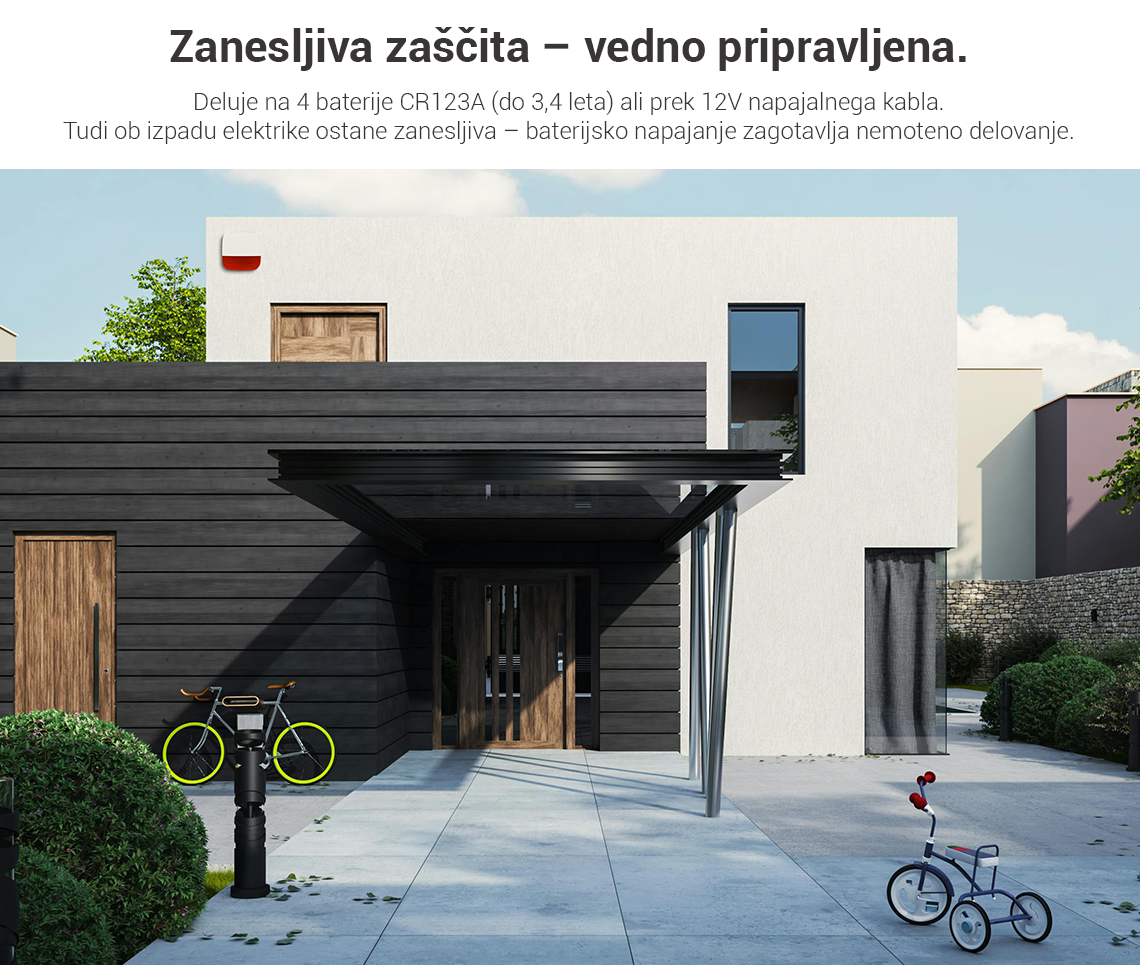 Življenjska doba baterije: 4 baterije CR123A lahko uporabljate 3,4 leta (če se sproži vsakih štirinajst dni in se alarm oglasi 120 s vsakič z izkoristkom baterije 80 %)