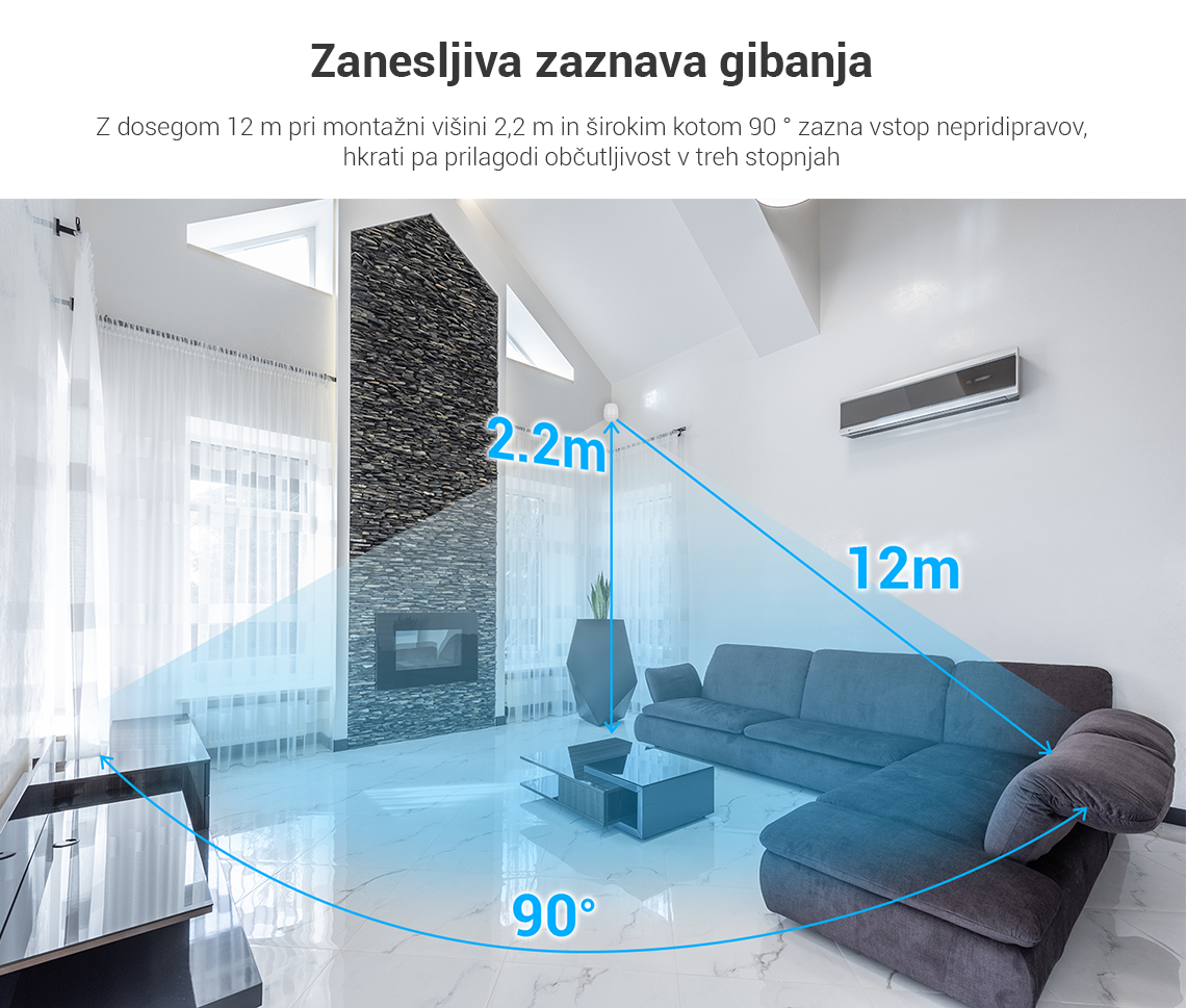 Domet zaznavanja: 12 m (90°) z višino namestitve 2,2 m