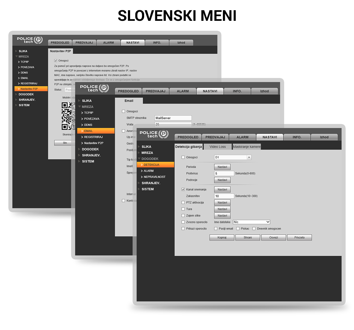 Sprožitveni dogodki: Snemanje, PTZ, tura, video push, email, FTP, posnetek, buzzer in nasveti na zaslonu