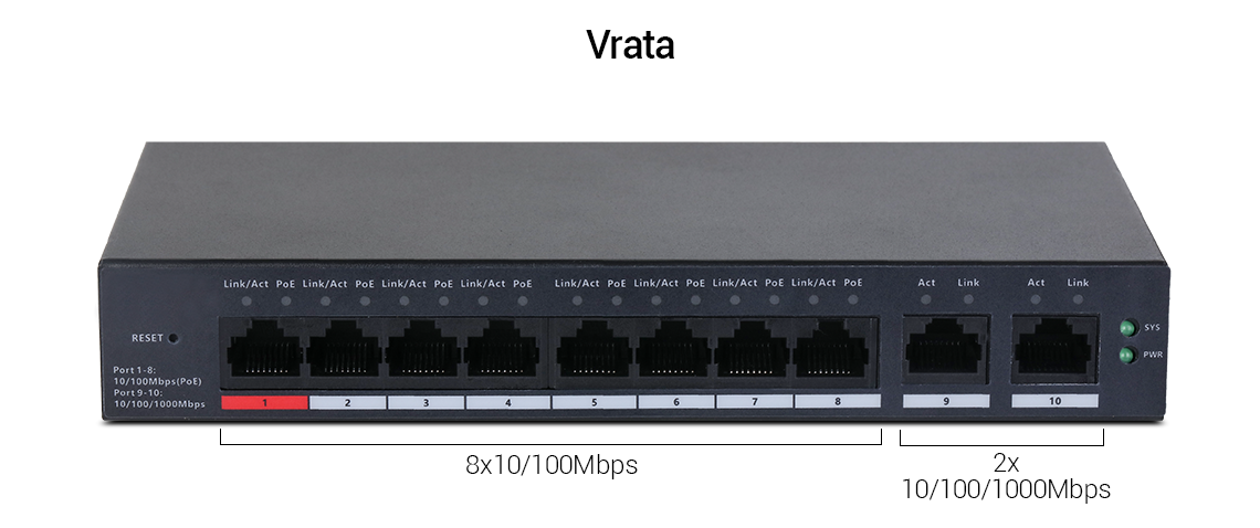 Opis funkcijskih rež: Vrata 1-8: 8 × RJ-45 10/100 Mbps (PoE); Vrata 9-10: 2 × RJ-45 10/100/1000 Mbps (navzgornja povezava)