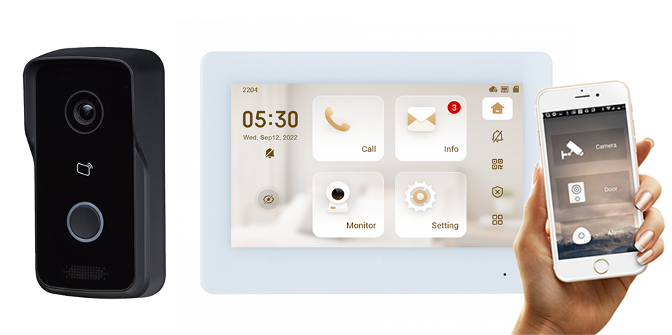 2mp barvna cmos kamera + upravljanje preko pametnega telefona + 7 palčni barvni tft zaslon na dotik + utp povezava + odklepanje vrat + možnost alarma + bralec mifare kartic + možna povezava s kamero + interkom funkcija + led napajalnik