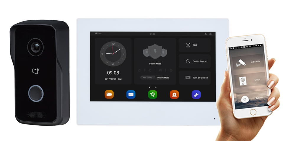2mp barvna cmos kamera + upravljanje preko pametnega telefona + 7 palčni barvni tft zaslon na dotik Android 8.1 + utp povezava + odklepanje vrat + možnost alarma + bralec mifare kartic + možna povezava s kamero + interkom funkcija + led napajalnik