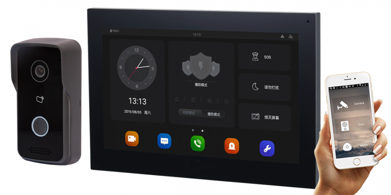 2mp barvna cmos kamera + upravljanje preko pametnega telefona + 10 palčni barvni tft zaslon na dotik + utp povezava + odklepanje vrat + možnost alarma + bralec mifare kartic + možna povezava s kamero + interkom funkcija + led napajalnik