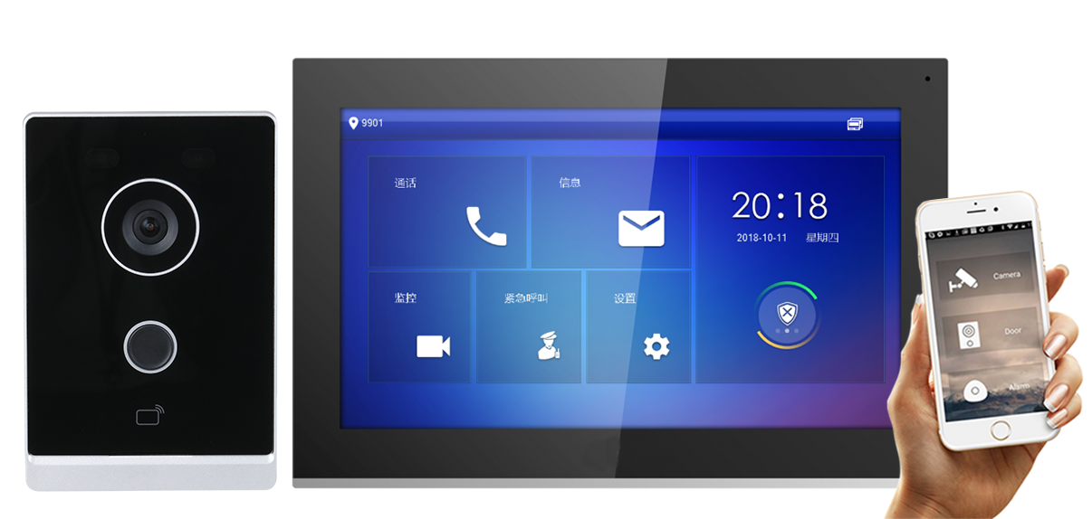 2mp barvna cmos kamera + upravljanje preko pametnega telefona + 10 palčni barvni tft zaslon na dotik + utp povezava + odklepanje vrat + možnost alarma + bralec mifare kartic + možna povezava s kamero + interkom funkcija + led napajalnik
