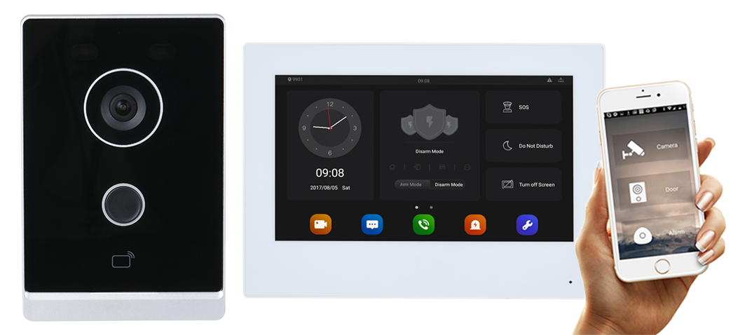 2mp barvna cmos kamera + upravljanje preko pametnega telefona + 7 palčni barvni tft zaslon na dotik Android 8.1 + utp povezava + odklepanje vrat + možnost alarma + bralec mifare kartic + možna povezava s kamero + interkom funkcija + led napajalnik