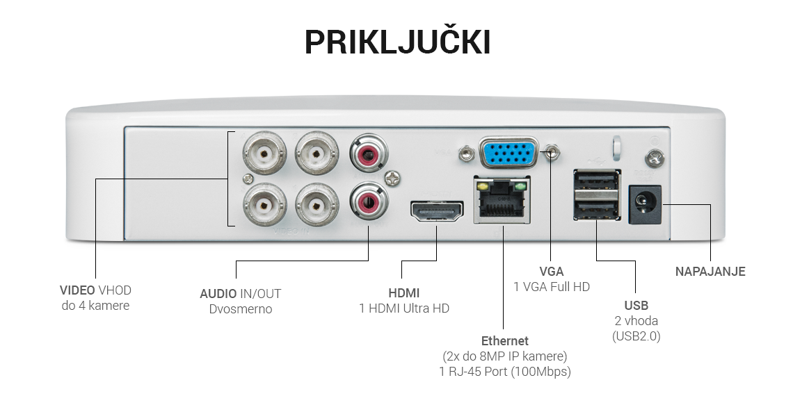 Vhod IP kamere: 4 + 2 kanal, vsak kanal do 8MP