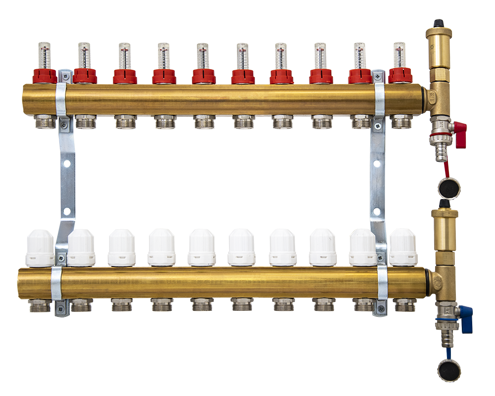 Razdelilec sestavlja: dovodni razdelilec z regulacijskimi ventili (z merilnikom pretoka), odvodni razdelilec z regulacijski ventili (ročni) z možnostjo zategovanja, T člen, polnilna pipa, nosilca