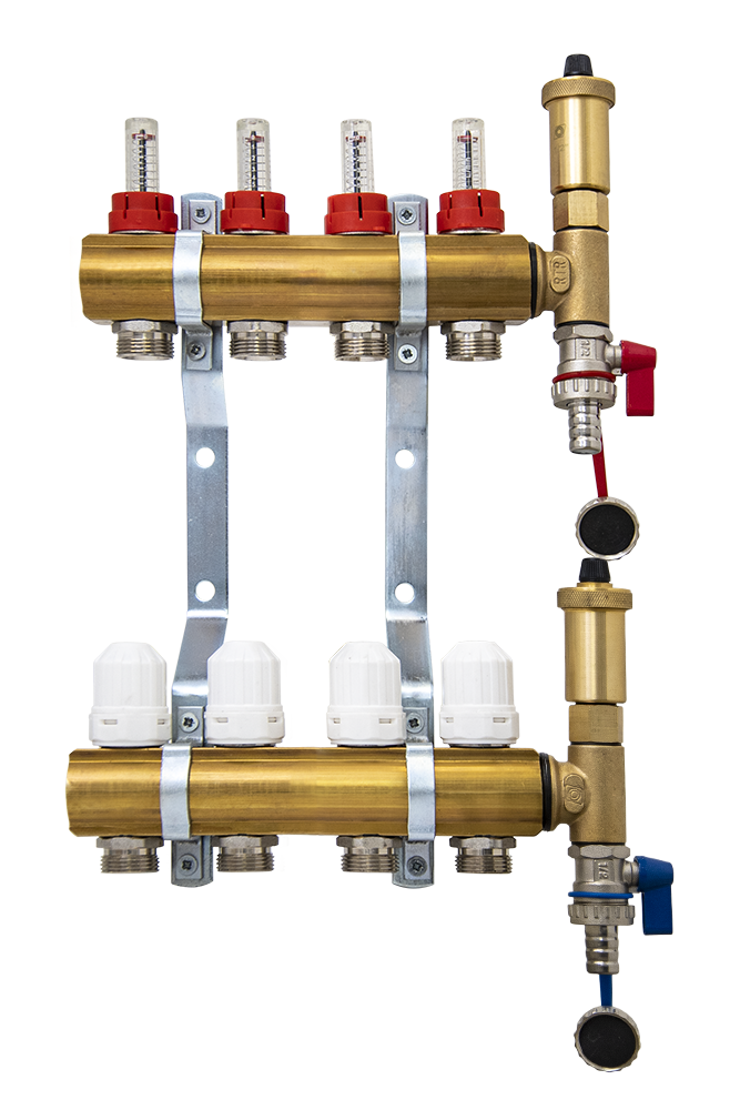 Razdelilec sestavlja: dovodni razdelilec z regulacijskimi ventili (z merilnikom pretoka), odvodni razdelilec z regulacijski ventili (ročni) z možnostjo zategovanja, T člen, polnilna pipa, nosilca