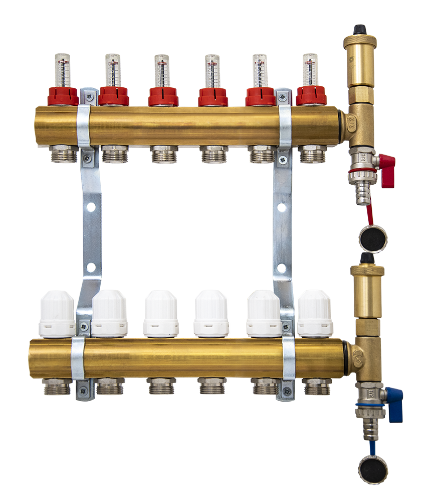 Razdelilec sestavlja: dovodni razdelilec z regulacijskimi ventili (z merilnikom pretoka), odvodni razdelilec z regulacijski ventili (ročni) z možnostjo zategovanja, T člen, polnilna pipa, nosilca