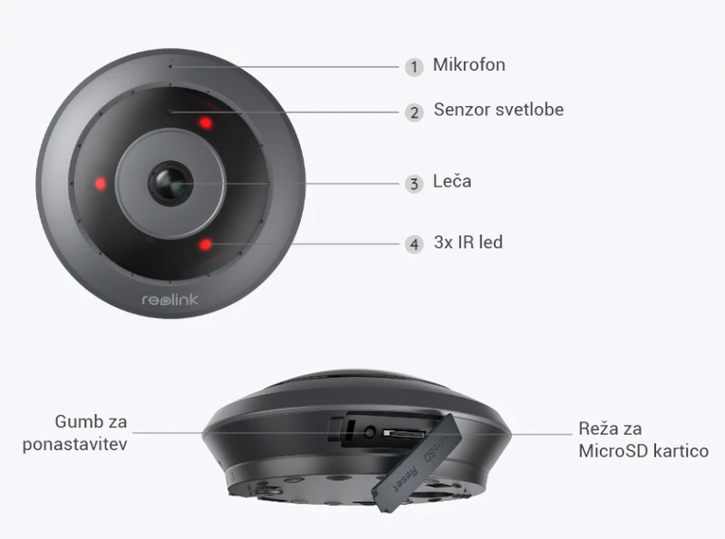 Vidno polje: Vodoravno: 180°; Navpično: 180°; Diagonala: 180°