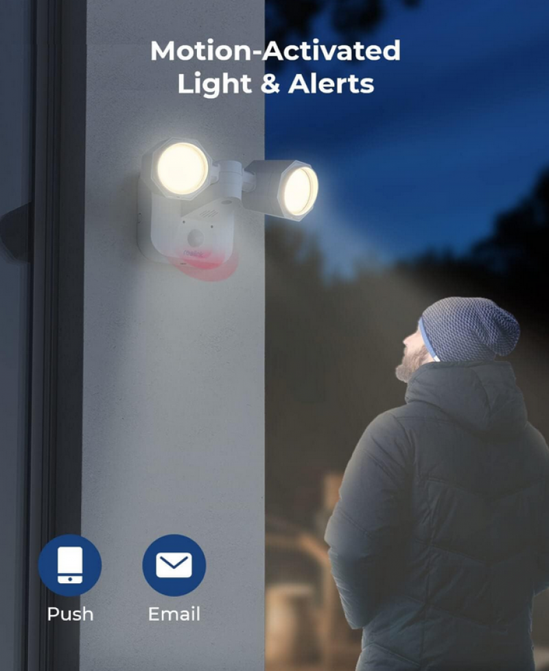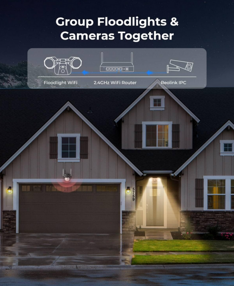 - Reolink Floodlight je mogoče povezati s kamerami Reolink za ustvarjanje sistema pametnega doma. Če kamera zazna dogodek, se sprožijo njeni reflektorji in vgrajena sirena.